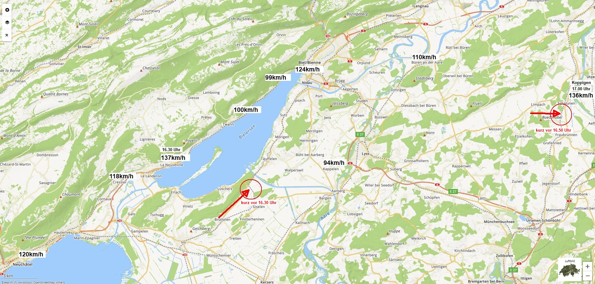 Hier noch ein Kärtchen mit Böenspitzen in der Region Bielersee
