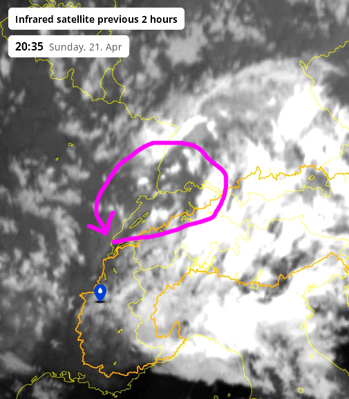 Gemäss dem Satellitenloop sind wir momentan im (ovalen) Auge des Höhentiefs. Wie im Auge des Hurrikans hat es vielerorts schön aufgerissen. Da dürften die Temperaturen in den Keller rasseln, vor allem dort, wo noch Schnee am Boden liegt. Die Bodentemperatur ist z.T. schon ziemlich im negativen Bereich (so um die -2 Grad). Es fragt sich nur, wann es wieder zudeckt, später in der Nacht soll erneut Schneefall einsetzen. So oder so, Dauerstress für die fortgeschrittene Vegetation.