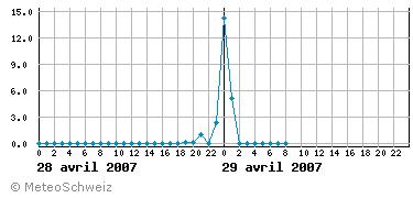 Während gut 3 Stunden rumpelte es in Neuenegg mächtig, jedoch hatten wir keinen Hagelschlag. Auf der Heimfahrt Richtung Seeland war Starkniederschlag angesagt, so dass das Wasser auf der Strasse zum Teil nicht abfliessen konnte. Gegen Mitternacht warf ich meinen ersten Blick Richtung Niederschlagsradar und sah, dass die Gewitterzelle Richtung Chasseral zog, wo sie sich später auflöste. Die Messstation auf dem Chasseral verzeichnete auf kurz heftigen Niederschlag!