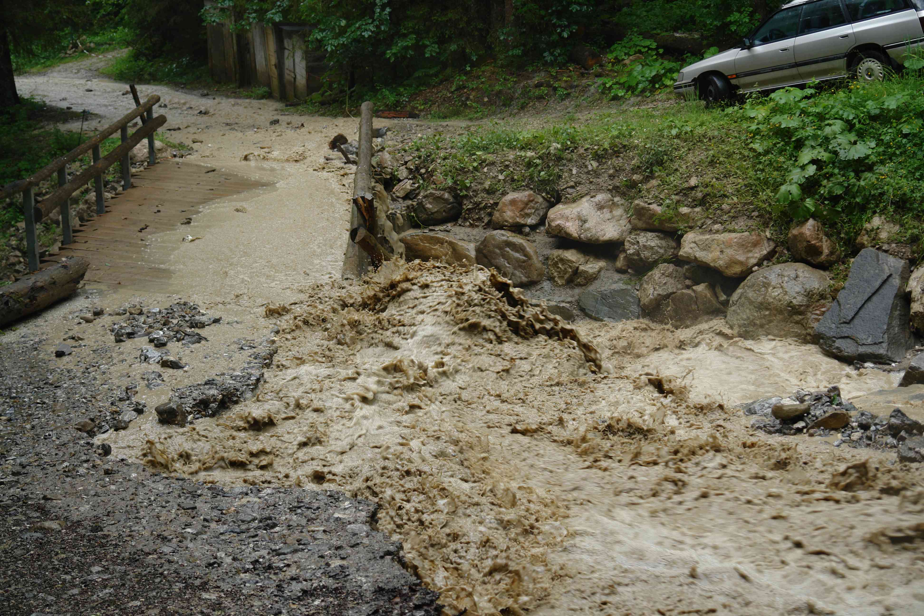 Unsere Kirche läutet gerade Sturmalarm, die Feuerwehr ist ausgerückt und der Bach ist noch extremer als oben gezeigt ...