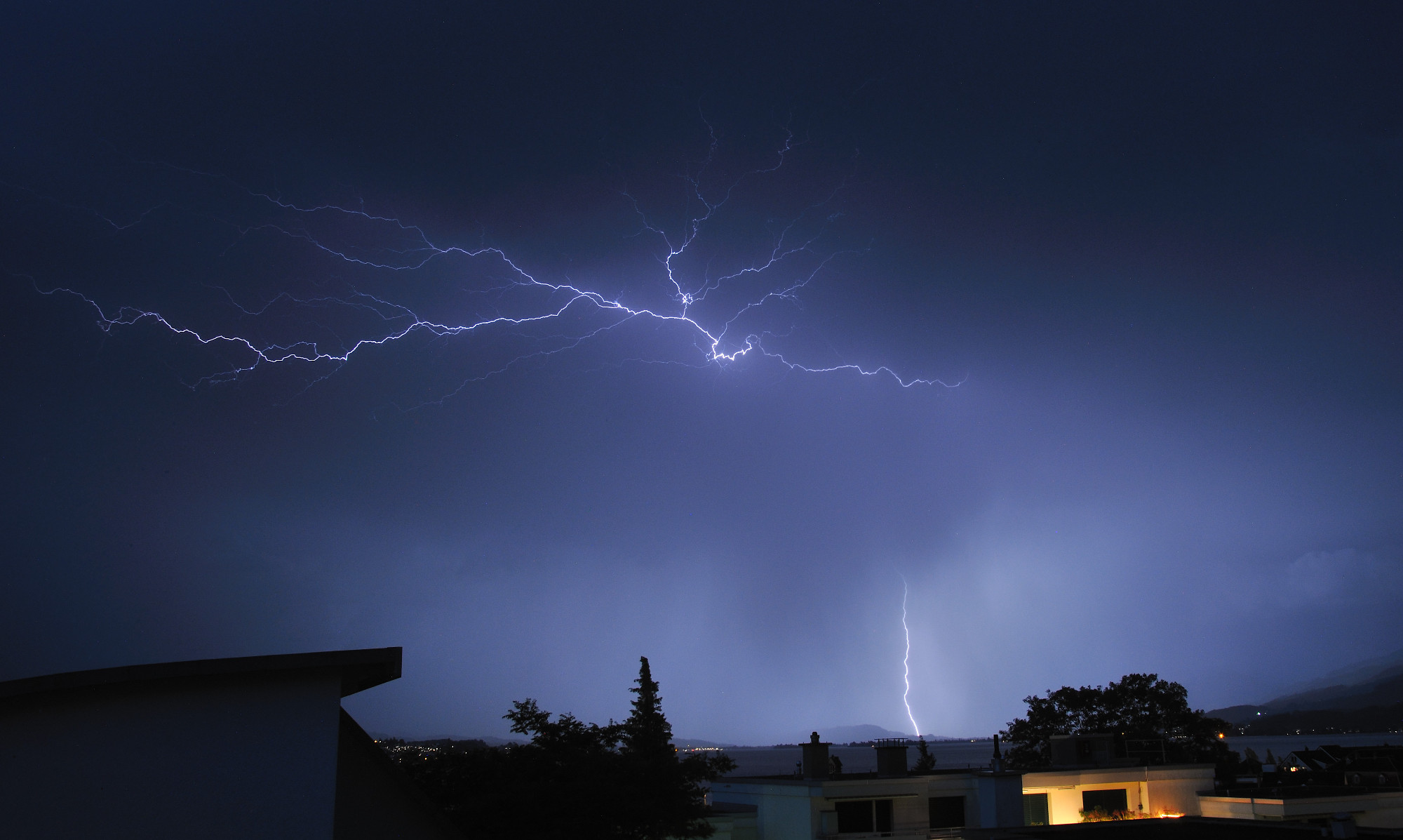 Eine kurze Anmerkung zum zweiten, recht heftigen Blitz mit mehreren hundert Kiloampere bei Einsiedeln: Der Donner zu Beginn rund 3 Sekunden nach dem Einschlag stammt meiner Ansicht nach von einem zweiten Blitz (cloud to cloud), welcher durch den ersten positiven Blitz (cloud to ground) getriggert wurde und in meine Richtung am Himmel verlief. Der Donner des eigentlichen Blitzes folgt erst später und ist am dumpfen Poltern zu erkennen. Dieses Phänomen von solchen getriggerten, sekundären Entladungen am Himmel konnte ich am gleichen Abend auch fotografisch festhalten, hier ein Beispiel eines solches getriggerten Wolkenblitzes durch einen positiven Blitzeinschlag.