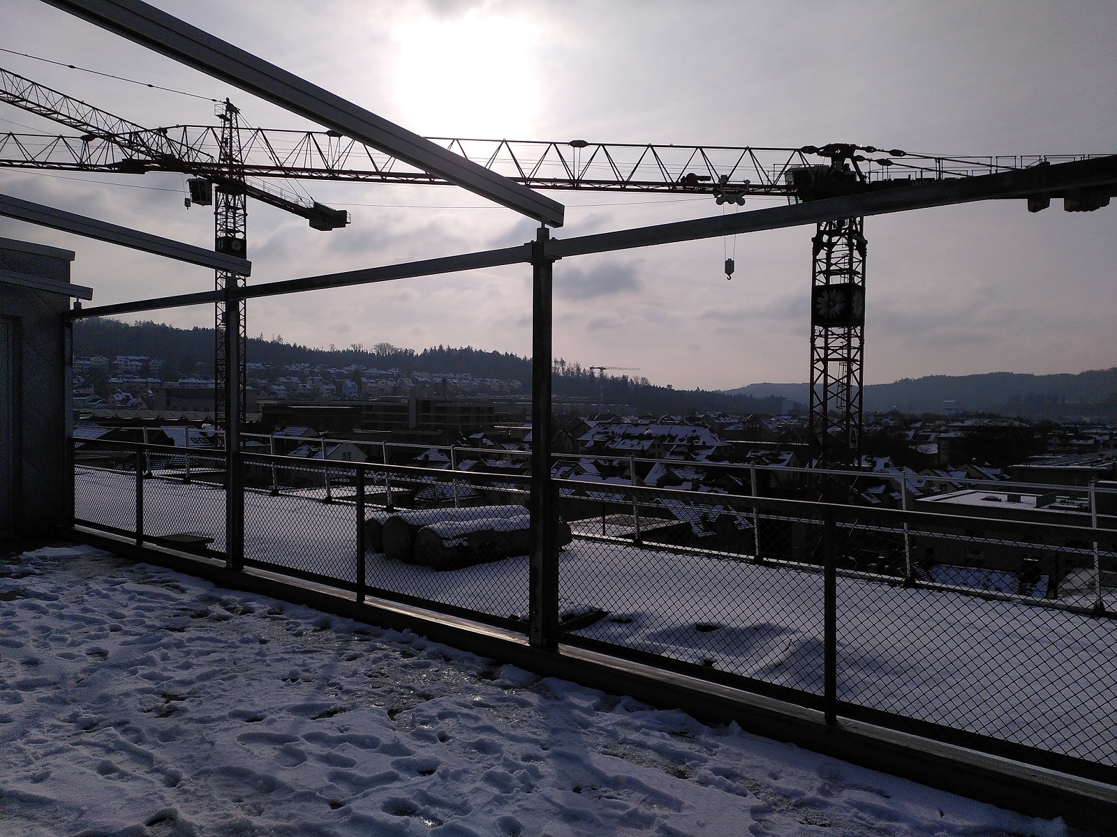Soeben war ich kurz auf der Gemeinschaftsdachterrasse für eine kurze Pause. Unter den Füssen spürt man Eis und Schnee. Es geht ein kalter Wind. Man blick über die schneebedeckten Gebäude- und Hausdächern der Stadt.
