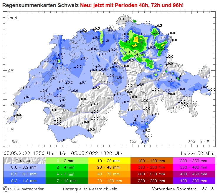 Es gibt viele erstaunenswerte Wetterereignisse. Die fortschreitende Front eines Hochwassers in einem Bach oder Fluss nach intensiven Niederschlägen ist für mich besonders interessant. Ungefähr in der Region um Turbenthal muss es heute intensiv geregnet haben. Eine zweite intensive Zelle steht hier in der Region Bichelsee.