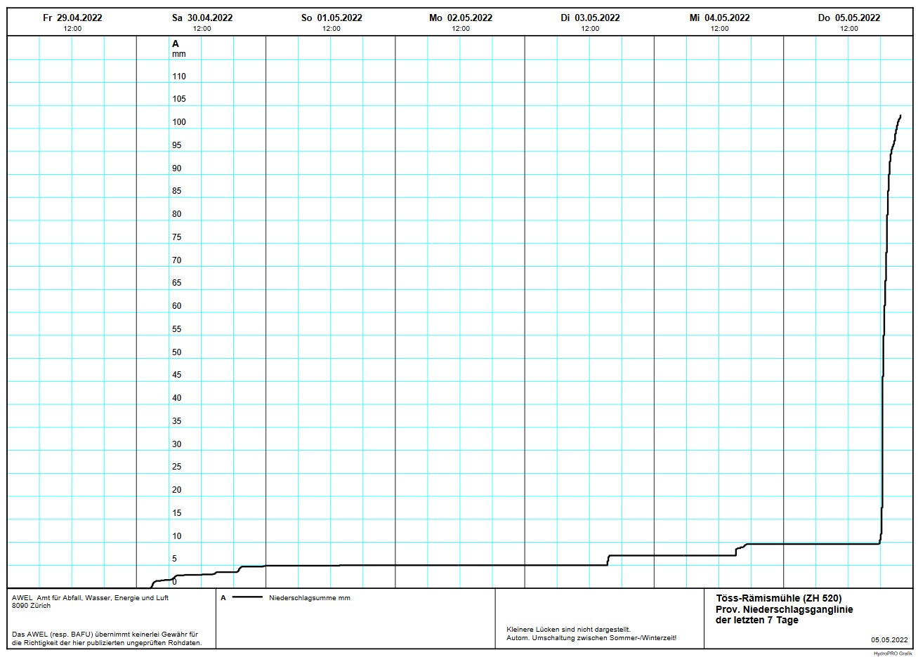 Auf jeden Fall muss in der Töss ein entsprechendes Hochwasser unterwegs sein. Und siehe da, es ist an der Messstelle in Neftenbach angekommen.