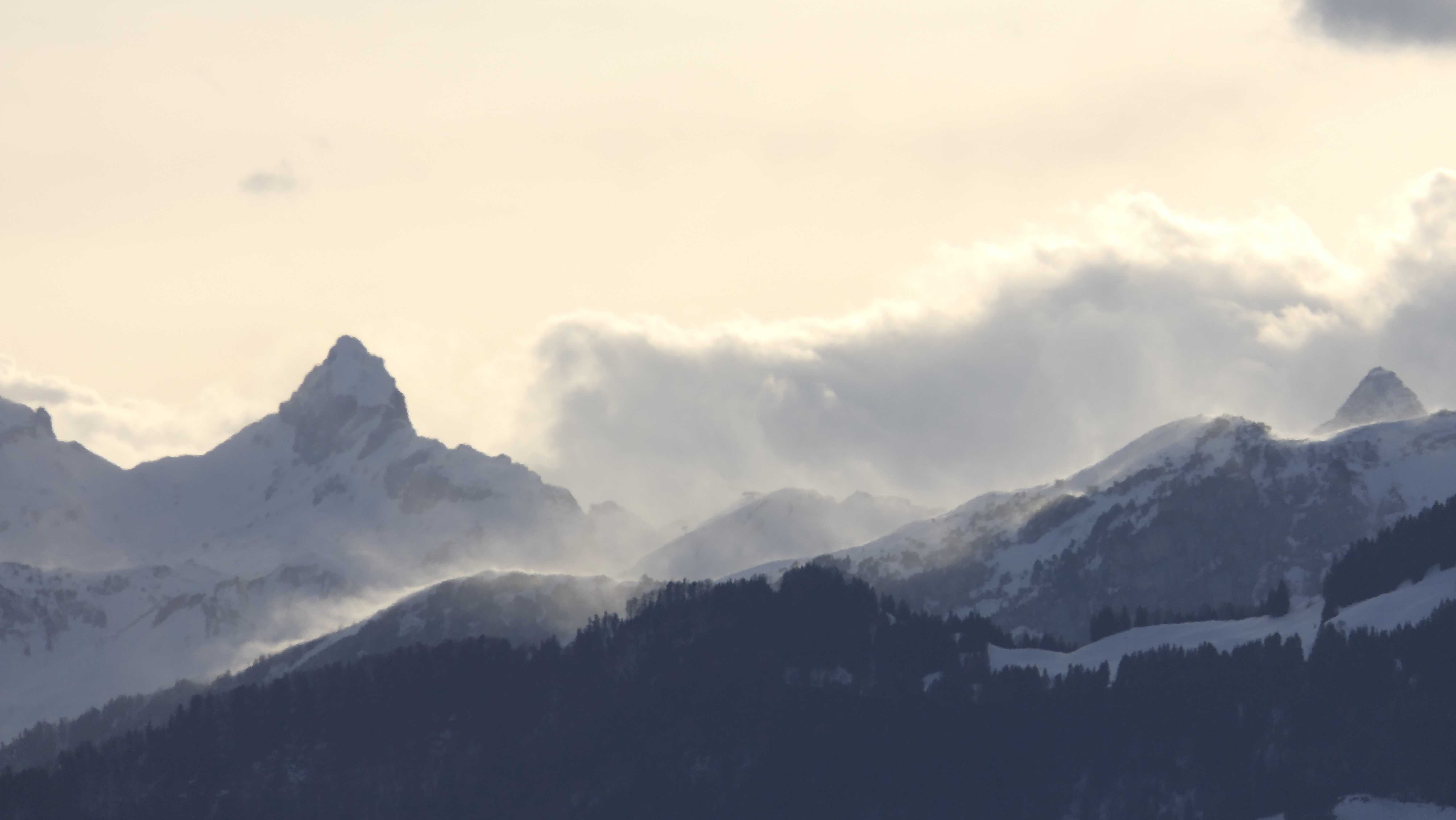 Beim genauen Hinschauen kann man sehen wie der Schnee vom Sturm über die Bergrücken verweht wird.