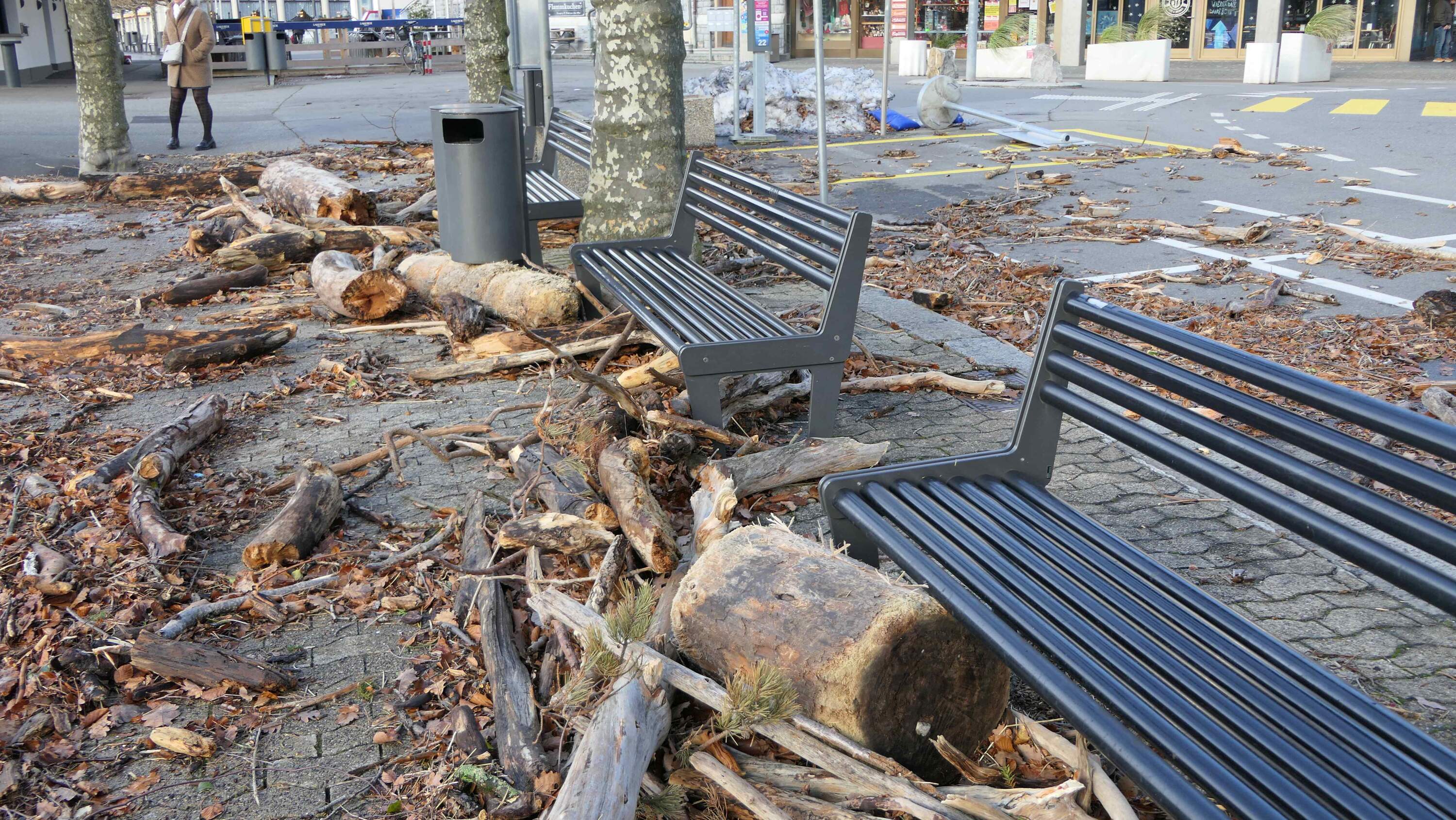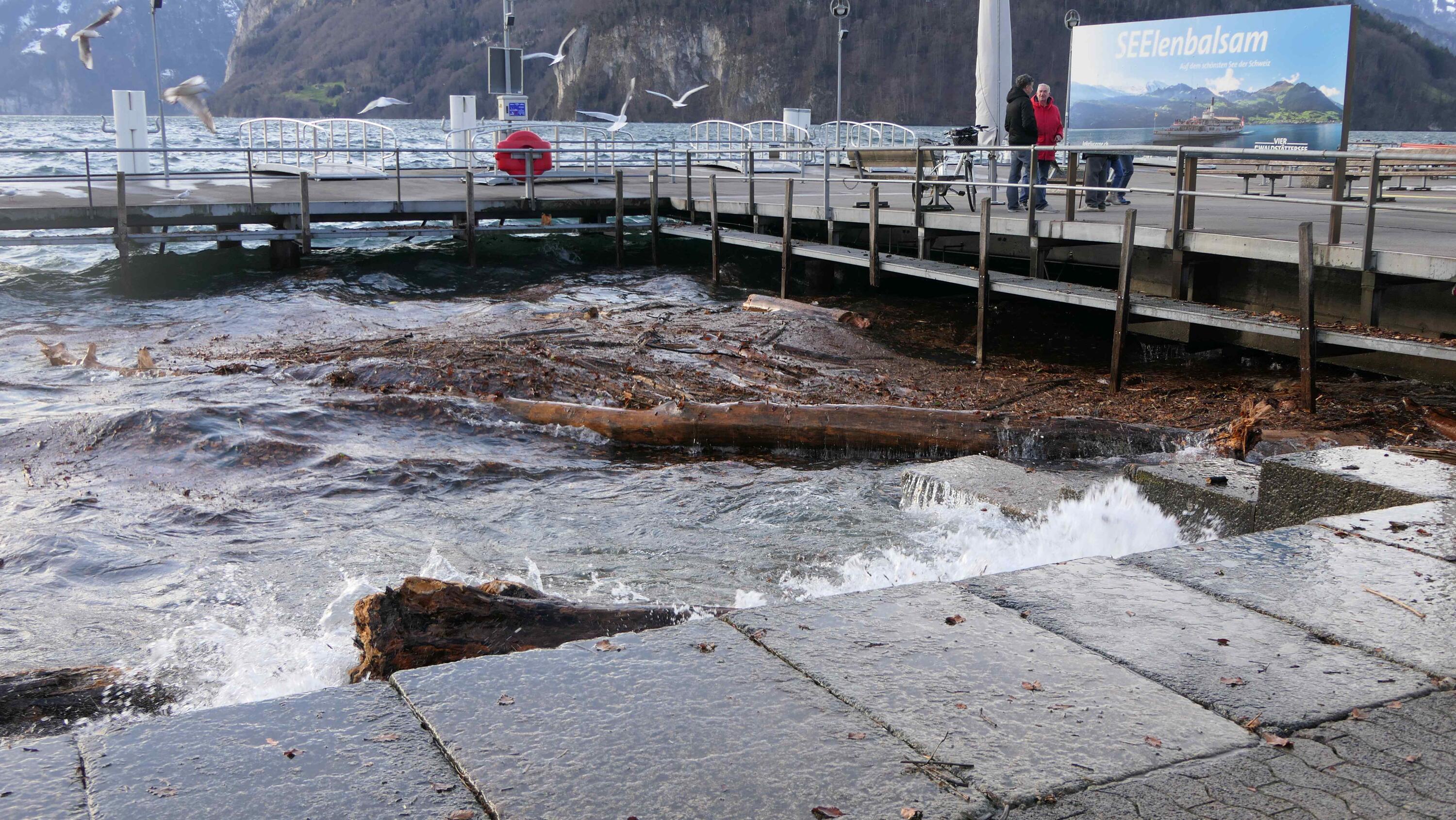 Später in Brunnen. Der Sturm hat den Parkplatz am Quai vorübergehend als Depot für das Schwemmholz beschlagnahmt.