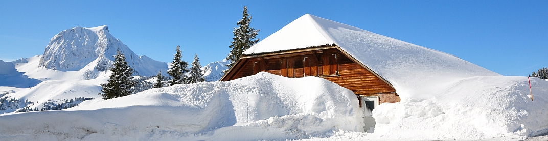 Die offizielle Schneehöhe beträgt 164cm. Bei dieser Alp liegt der erste Stock frei, das Erdgeschoss ist eingeschneit (siehe Dachkante unten rechts):