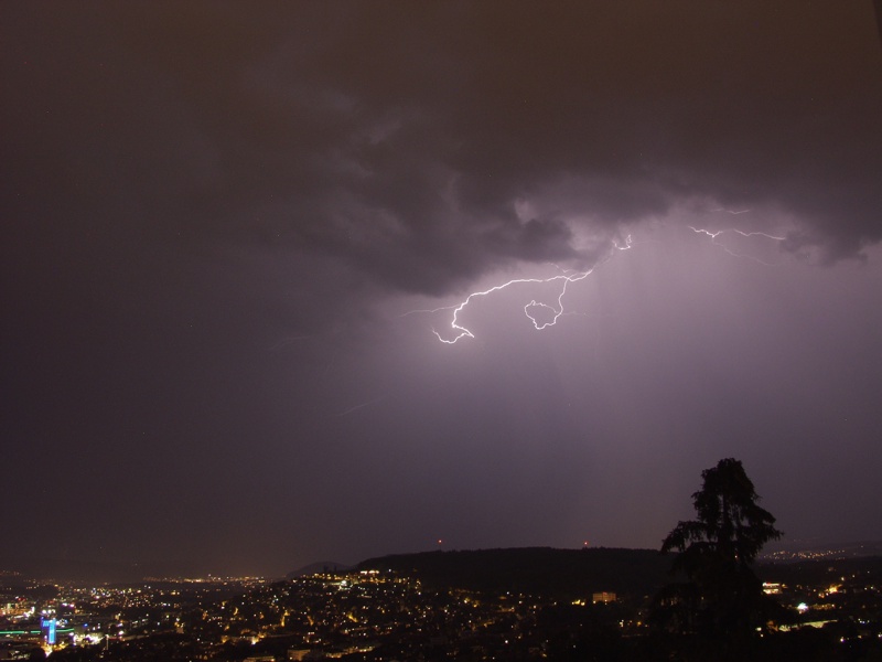 Die Gewitterzelle über Dietikon-Bülach produzierte Wolkenblitze rund alle 5s. Jetzt gibts vermehrt Erdblitze das Limmattal hinab. Leider nur schwach zu sehen durch den dortigen Regen hindurch. Zürich bleibt weiterhin "verschont" obwohl auch hier dringend Regen nötig wäre. Wo nicht gespritzt wird ist vieles vertrocknet.