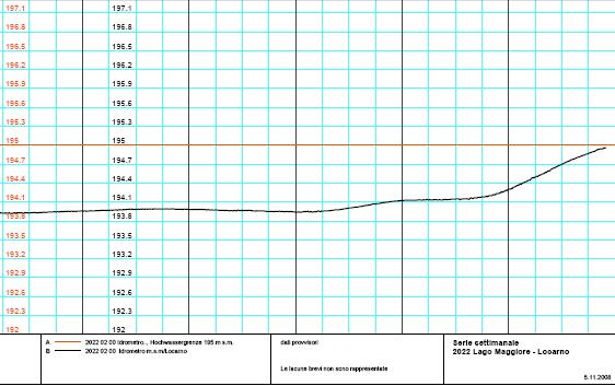Der Lago Maggiore hat meine Vermutung noch bei weitem übertroffen. Zurzeit liegt er mit 195.08m knapp 10cm über der Schadensgrenze. Unglaublich dass ein solcher See einfach um über eineinhalb Meter ansteigen kann, noch wenn es dermassen viel geregnet hat (danke Agio und Andreas für die Daten)!