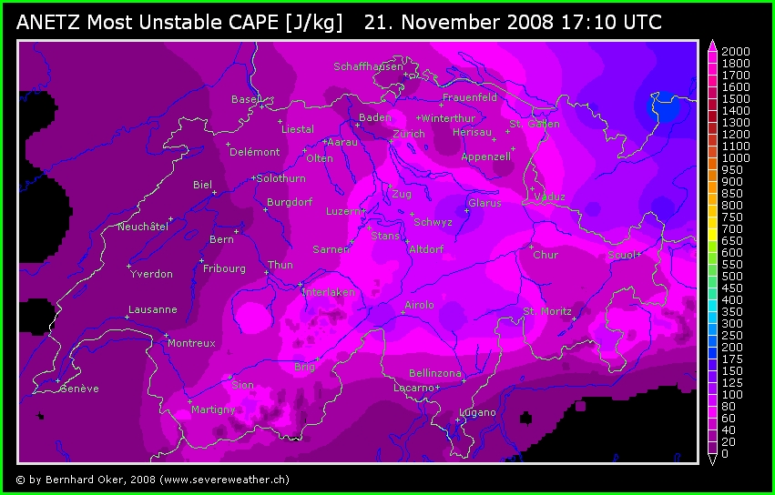 Ansonsten nicht viel Elektrizität, ausser ein wenig in Einsiedeln, Glarnerland und östlich des Rheintales. Ganz nett für das bischen CAPE, welches sich gebildet hatte.... :D
