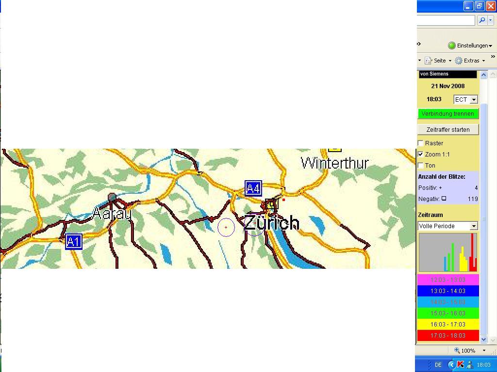 Das wären dann die beiden Blitze (violette Kreise), die Du um ca. 17 20 Uhr gehört hast. Von gesamtschweizerisch 4 positiven Einschlägen waren es zwei in Deiner Nähe. Einer davon mit Sicherheit in den Ütlibergturm (nördl. Einschlag). Ein dritter Blitz (negativ) in Örlikon.