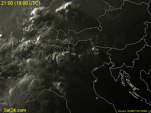 Ich fuhr also zu meinem alten "Hausberg" Hohentengen bei Bergöschingen, wo ich freie Sicht (mehr als 70 km) nach NW auf die erwähnten Zellen hatte. Der Eisschirm des imposanten cb's schlierte nach Osten ab und zeugte vom kurzfritigen Sterben, während im Westen permanenter Anbau sichtbar war. Sonderbar war die überraschend hohe Wolkenbasis. Nordwind setzte ein und dieses "Käsemesser" unterband sämtliche Konvektion. Ich fuhr zurück nach Kaiserstuhl, wo sich (wie Mike berichtete) plötzlich die Wolhuser-Zelle im Abendlicht präsentierte (s. Sat-Bild, weisser Fleck in Bildmitte):