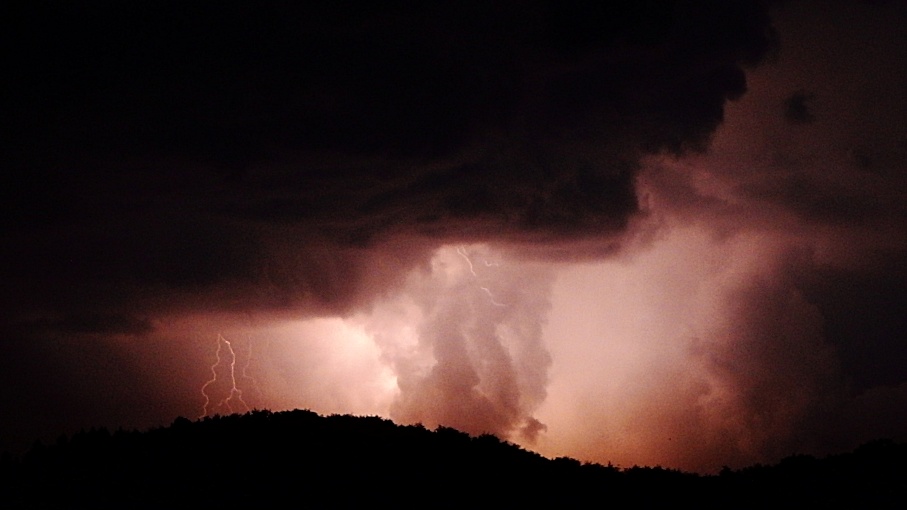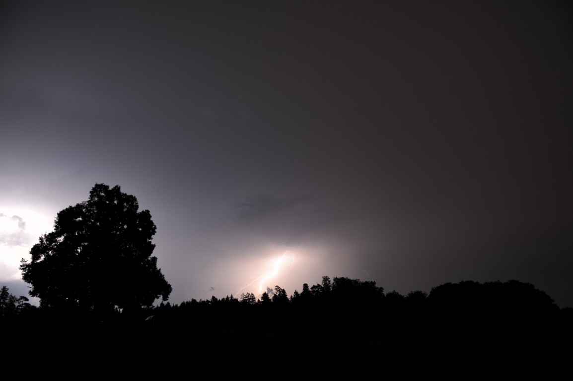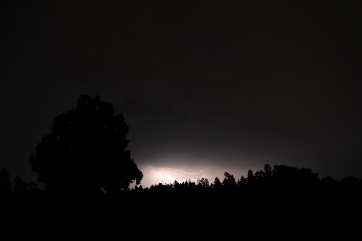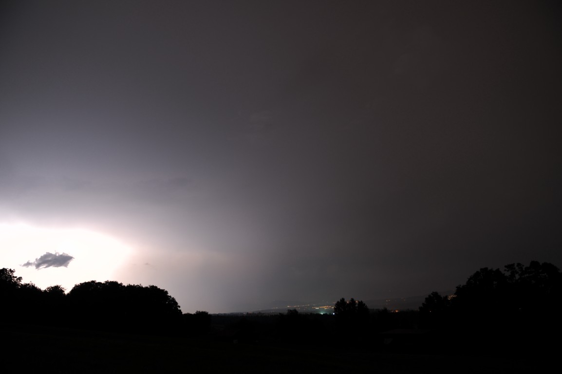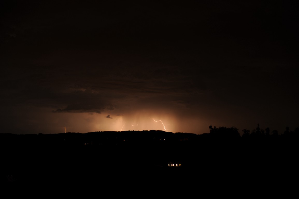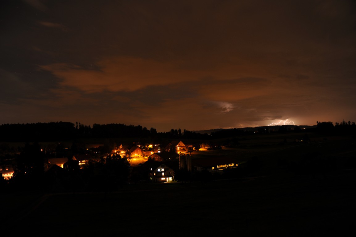 Das Wetterleuchten des im Süden durchziehenden Gewitters war beeindruckend. Leider etwas zu grosse Distanz für gute Blitzaufnahmen. Immerhin: grosse Leuchtkraft dieser Entladung, in etwa 40 km Distanz. Die rötliche Farbe entsprach etwa dem Eindruck von Auge.