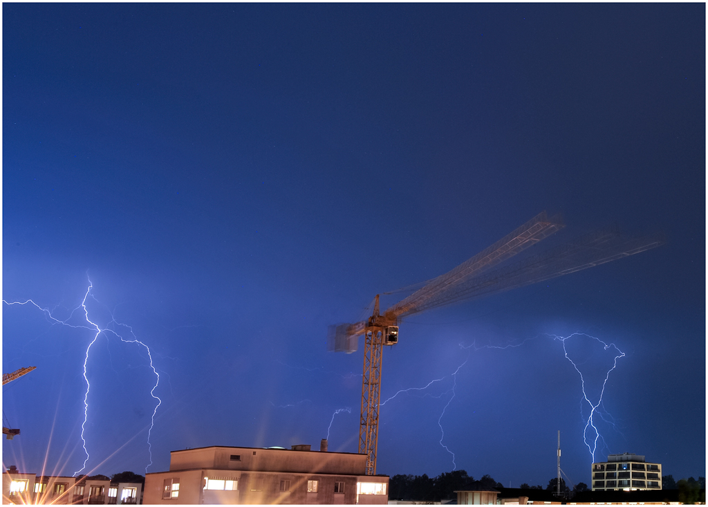 Das ganze ging mindestens ca. 20 km an meinem Standort vorbei, die Donner waren kaum zu hören. Nun hat sich die Blitzshow an den Bodensee verzogen. Nur ein paar auffrischende leichte Böen (bis ca. 20 km/h), sonst nichts. Und das bei immer noch 24-25 °C.