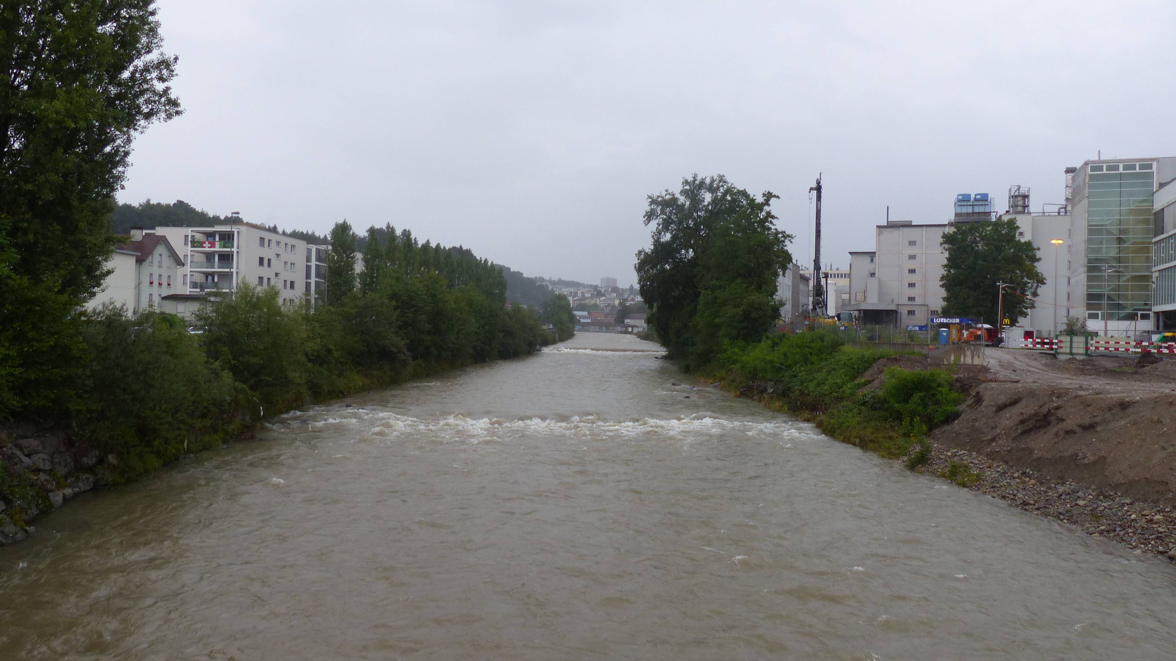 Die Kleine Emme beim Seetalplatz in Emmenbrücke um 19:27 Uhr. Es fliessen ca 30m³/s Wasser.