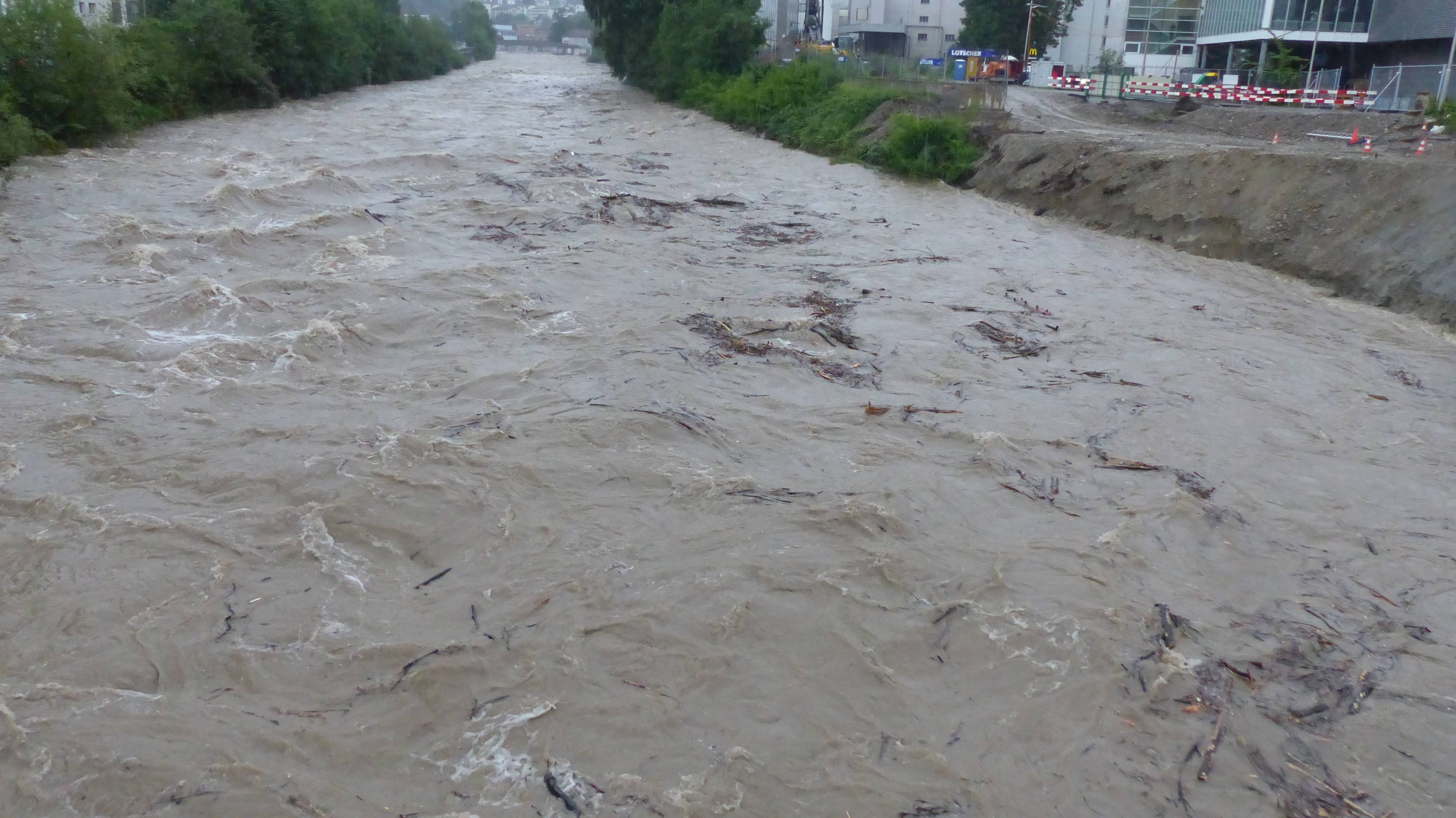 1.20m höher und +140m³/s innerhalb 11 Minuten. Es war vom Abfluss her ein normales Hochwasser. Aber zusehen, wie schnell der Fluss steigt, das ist beeindruckend.