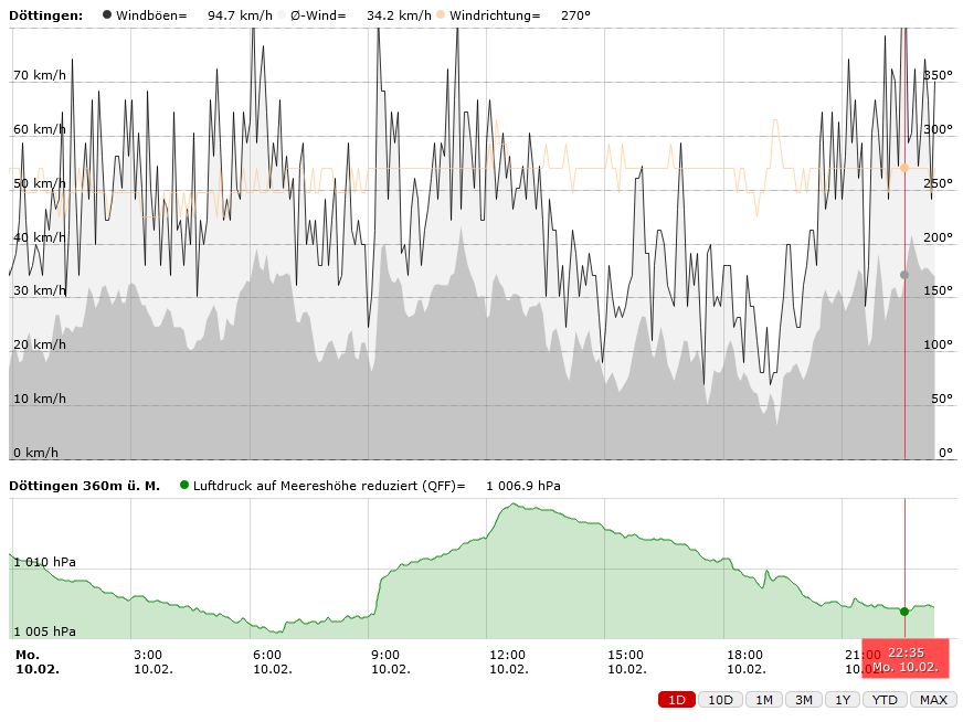 Während am Morgen nur vereinzelt Böen über 70km/h gemessen wurden sind es die letzen 2 Stunden schon über 8x über 70km/h.