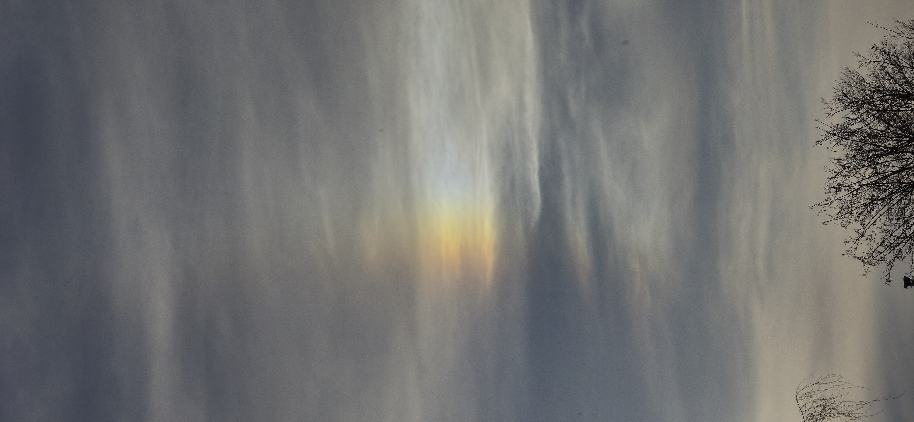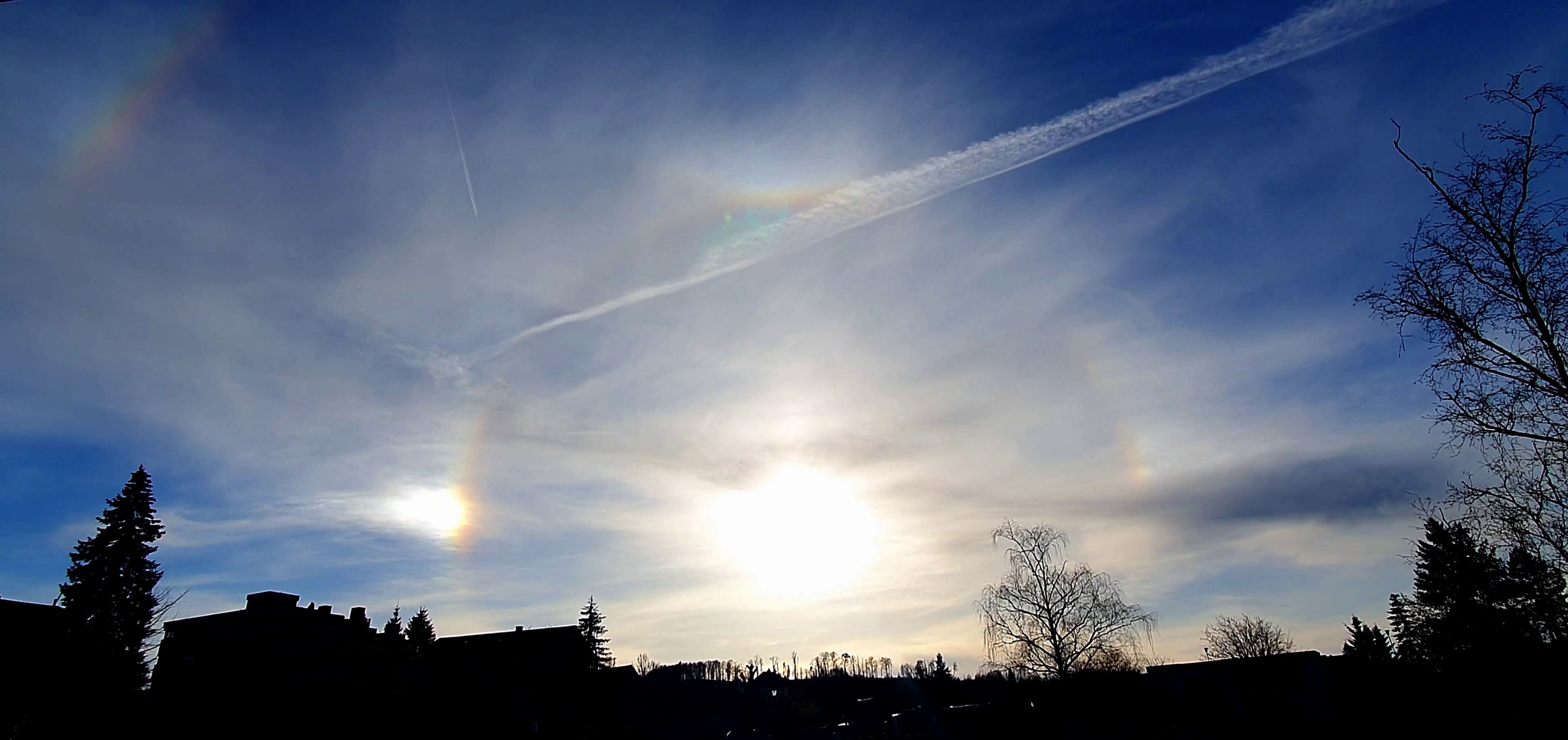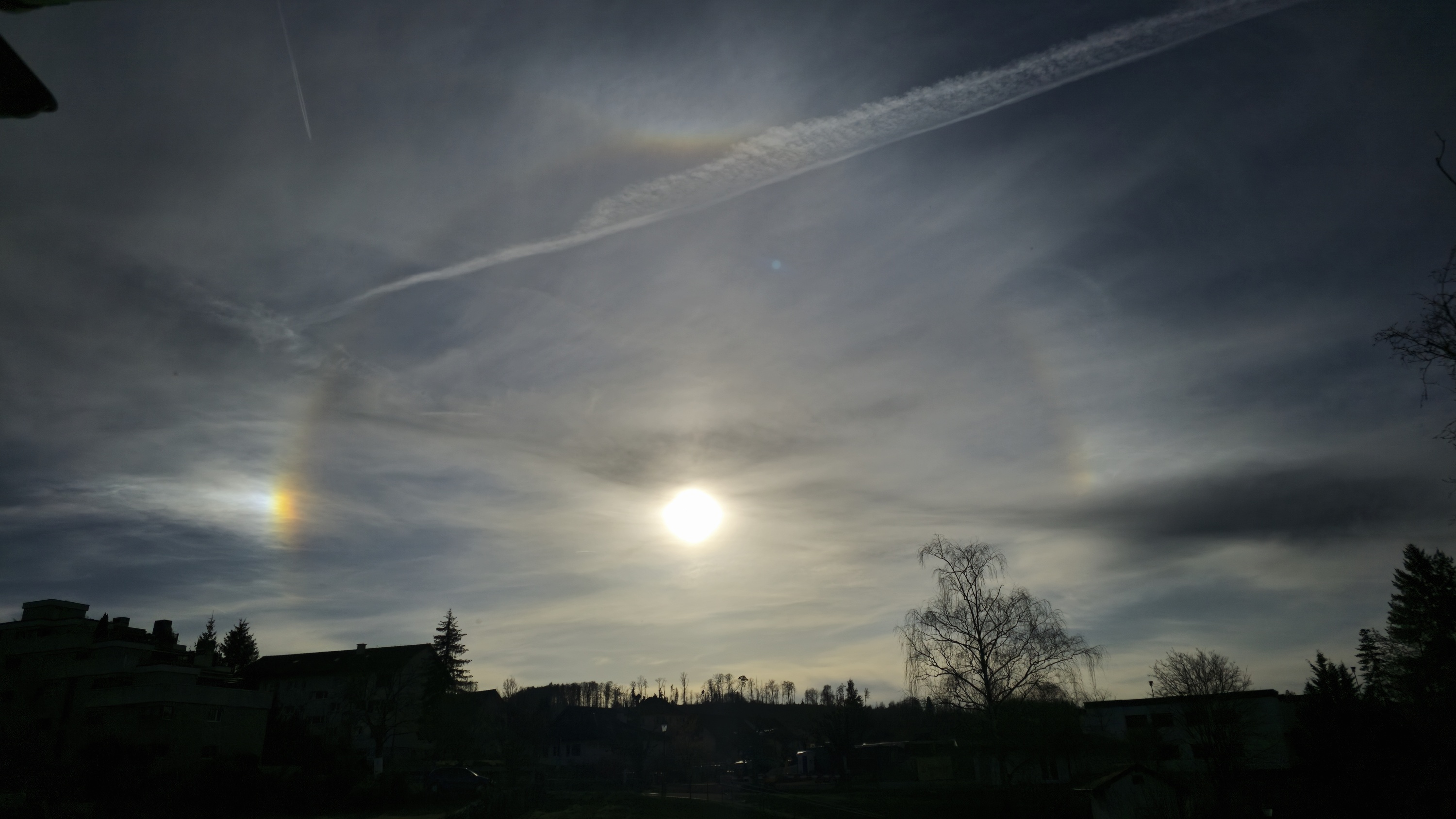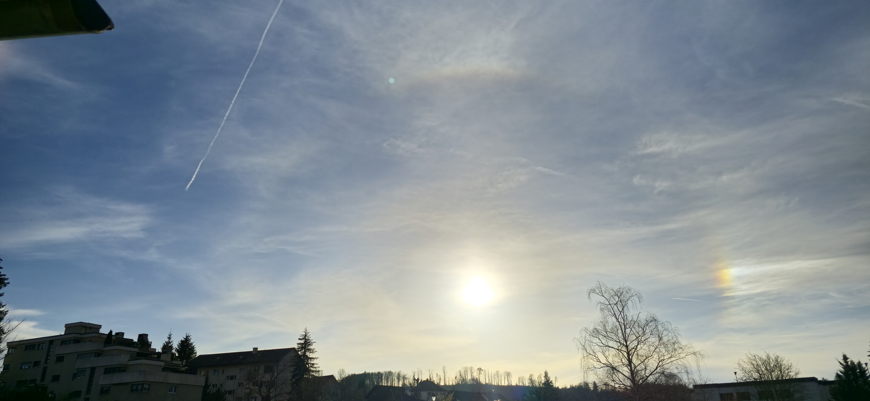 Für einen Bewohner des unteren Limmattals nahe dem Wasserschloss im Aargau, der auch in dieser Region aufgewachsen ist, stellt das mehrtägige Verharren unter der Nebelsuppe gerade in der gegenwärtigen Jahreszeit keinen ungewohnten Zustand dar. Doch die Gewöhnung macht es nicht unbedingt erträglicher – zumindest was mein Wohlbefinden angeht. Ich habe allerdings auch Leute im Umfeld, die das gelassener nehmen und das alltägliche Grau tatsächlich, so wurde es mir zumindest schon kommuniziert, auch geniessen können. Konträr dazu liegt mein Wettergenuss bei einer solchen Wetterlage dann viel eher in den Momenten, in denen Zeit gefunden wird, mit den ÖV an die Sonne zu fahren oder wenn es tatsächlich mal hier unten auflockert. So geschehen gestern. In der Lohnarbeit-Mittagspause erwärmten tatsächlich Sonnenstrahlen das Gemüt. Die Sonne war sogar flankiert von beidseitigen Nebensonnen. Die Aufnahme wurde in Baden mit einer schlechten Smartphone-Kamera gemacht, ich möchte sie trotzdem hier teilen: