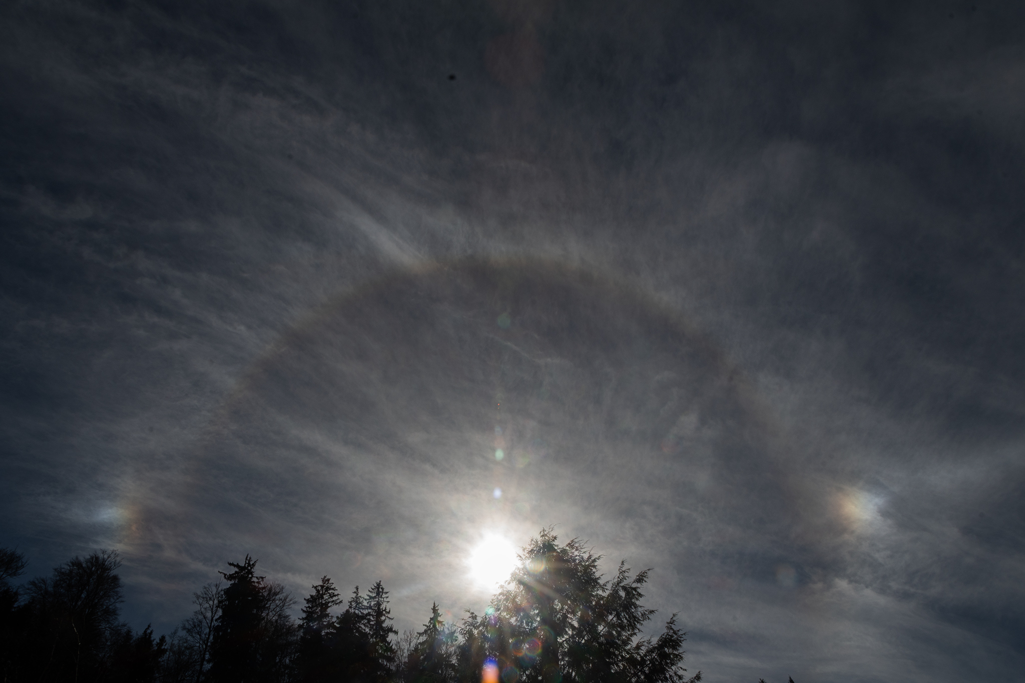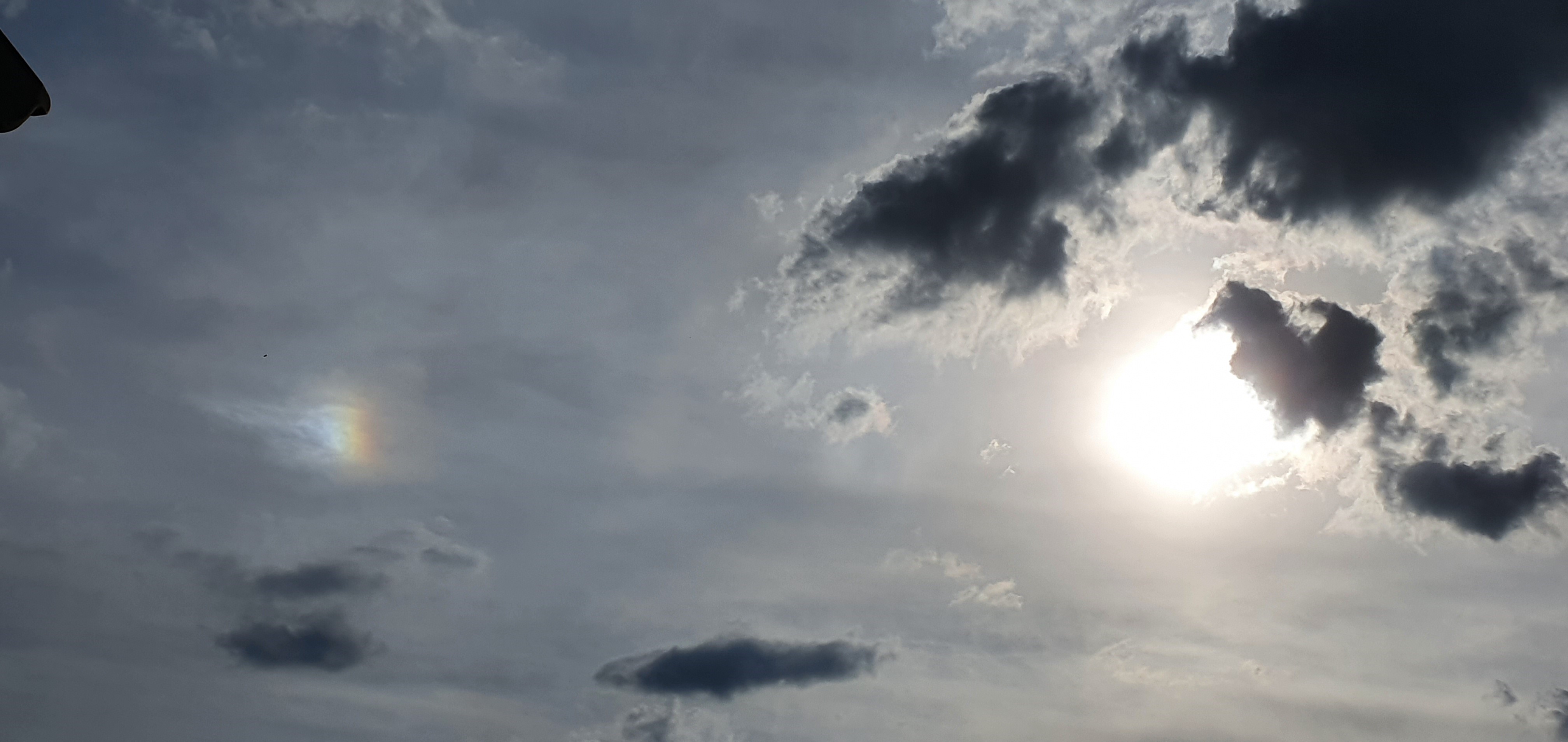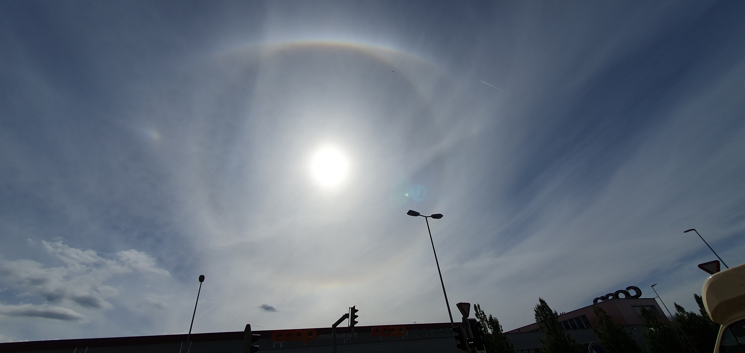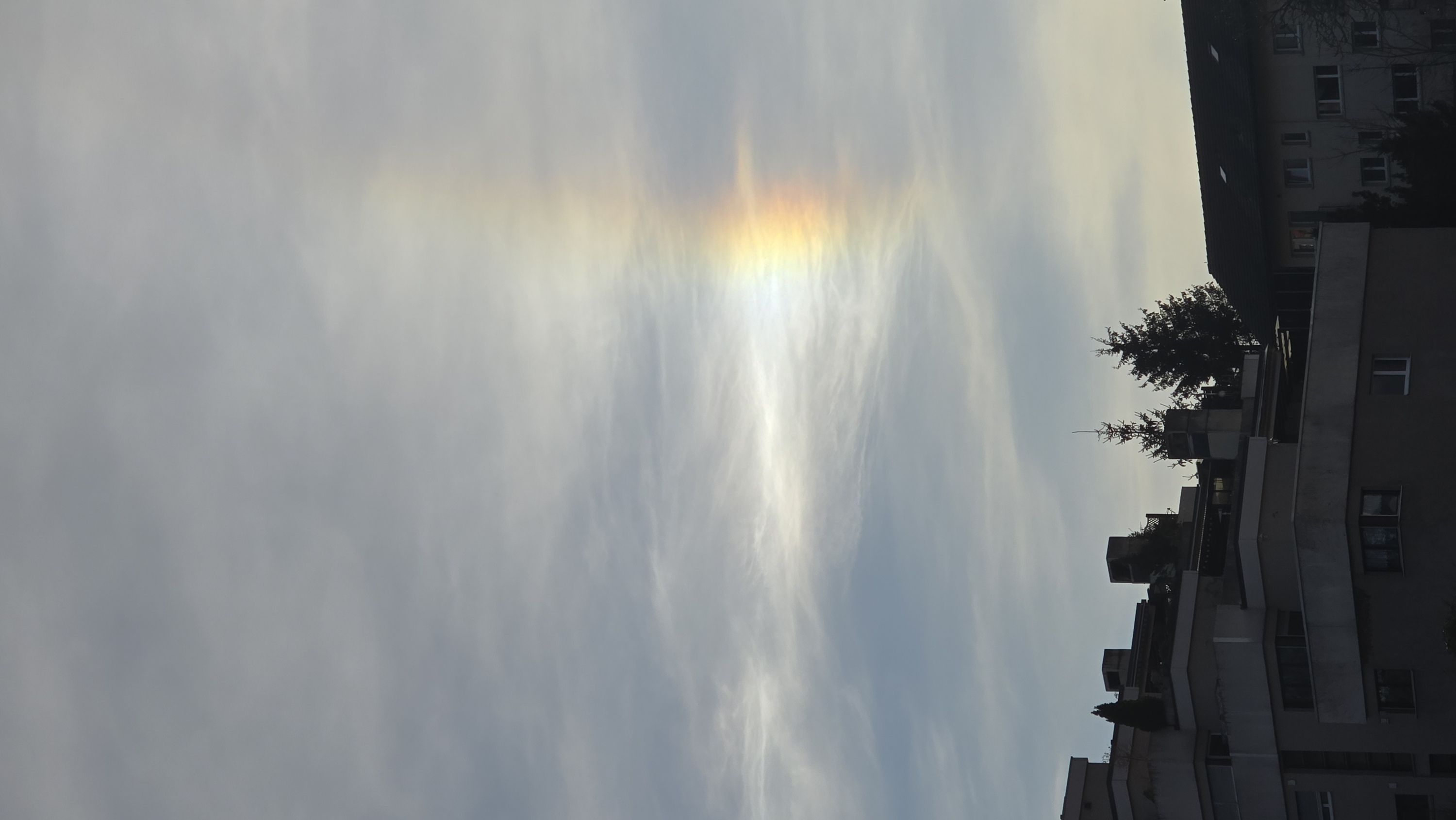 Für einen Bewohner des unteren Limmattals nahe dem Wasserschloss im Aargau, der auch in dieser Region aufgewachsen ist, stellt das mehrtägige Verharren unter der Nebelsuppe gerade in der gegenwärtigen Jahreszeit keinen ungewohnten Zustand dar. Doch die Gewöhnung macht es nicht unbedingt erträglicher – zumindest was mein Wohlbefinden angeht. Ich habe allerdings auch Leute im Umfeld, die das gelassener nehmen und das alltägliche Grau tatsächlich, so wurde es mir zumindest schon kommuniziert, auch geniessen können. Konträr dazu liegt mein Wettergenuss bei einer solchen Wetterlage dann viel eher in den Momenten, in denen Zeit gefunden wird, mit den ÖV an die Sonne zu fahren oder wenn es tatsächlich mal hier unten auflockert. So geschehen gestern. In der Lohnarbeit-Mittagspause erwärmten tatsächlich Sonnenstrahlen das Gemüt. Die Sonne war sogar flankiert von beidseitigen Nebensonnen. Die Aufnahme wurde in Baden mit einer schlechten Smartphone-Kamera gemacht, ich möchte sie trotzdem hier teilen: