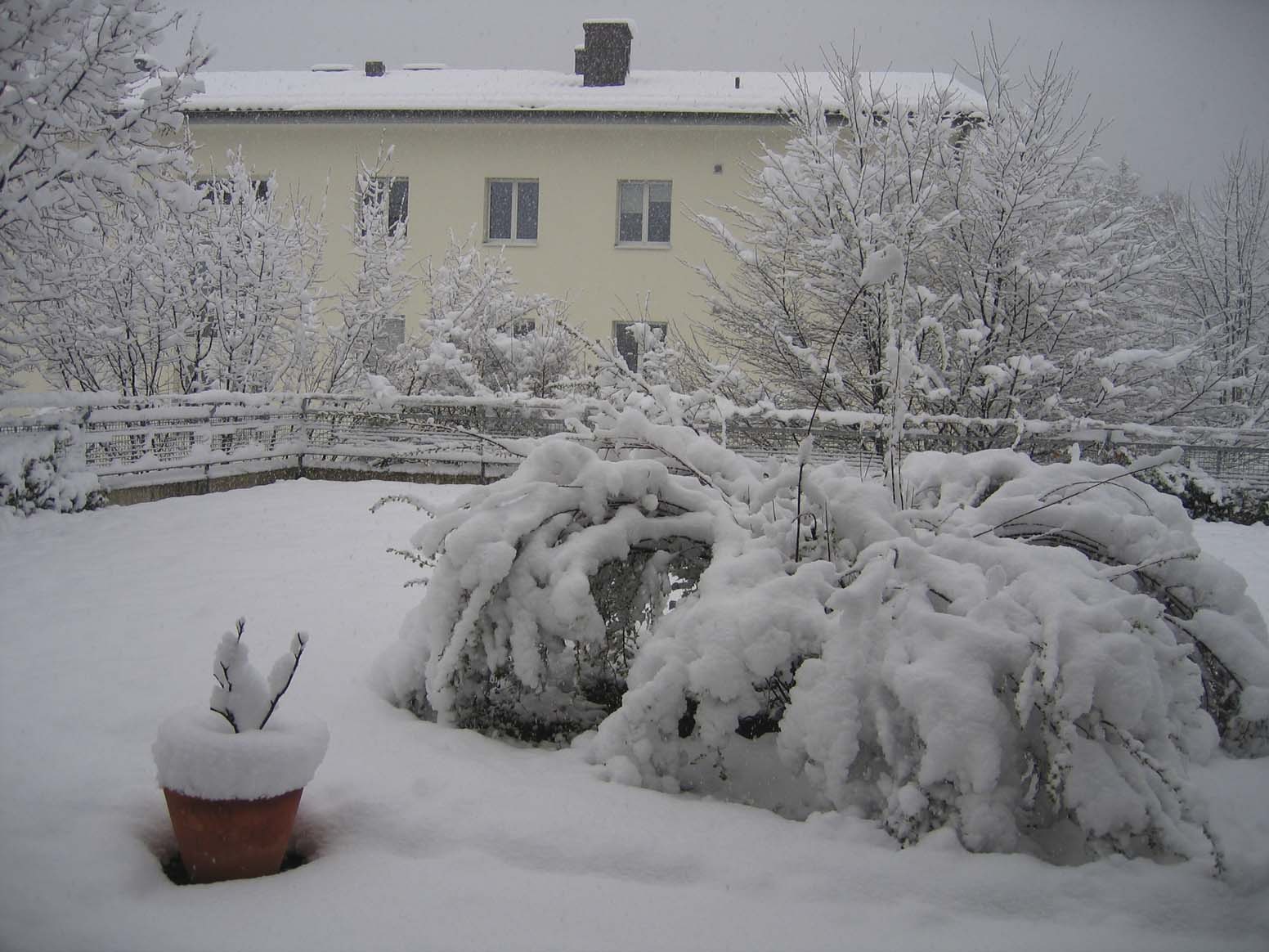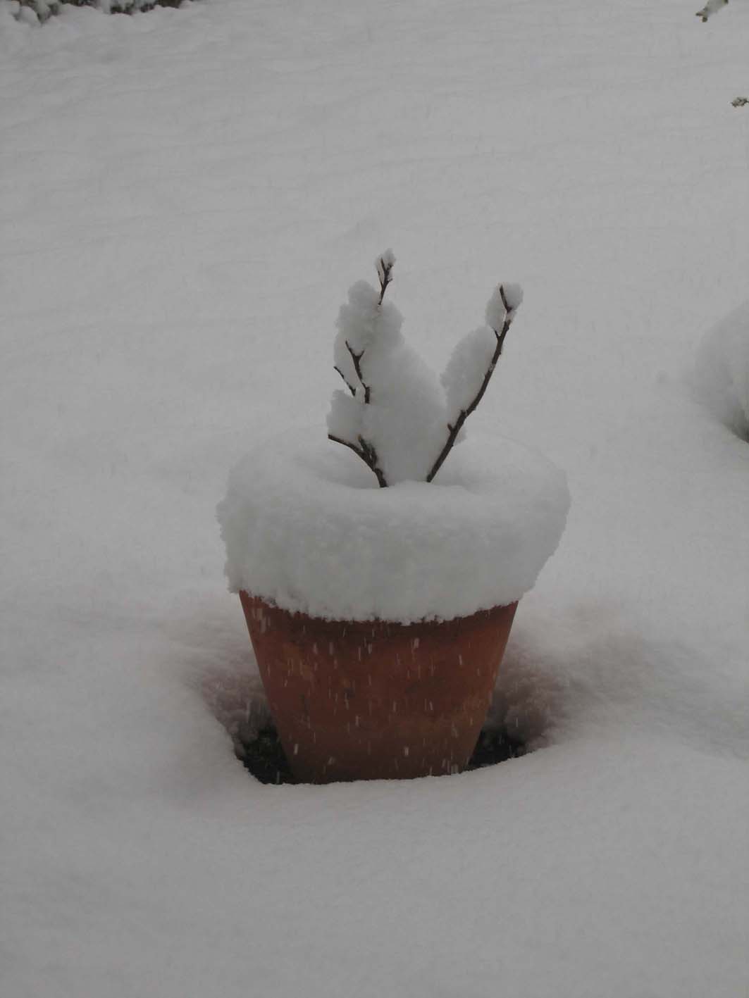 Die Sträucher biegen sich langsam unter der Schneelast, vor allem der Bambus (mit seinen Blättern) musste ich vorhin schon zum 2. Mal vom Schnee befreien.