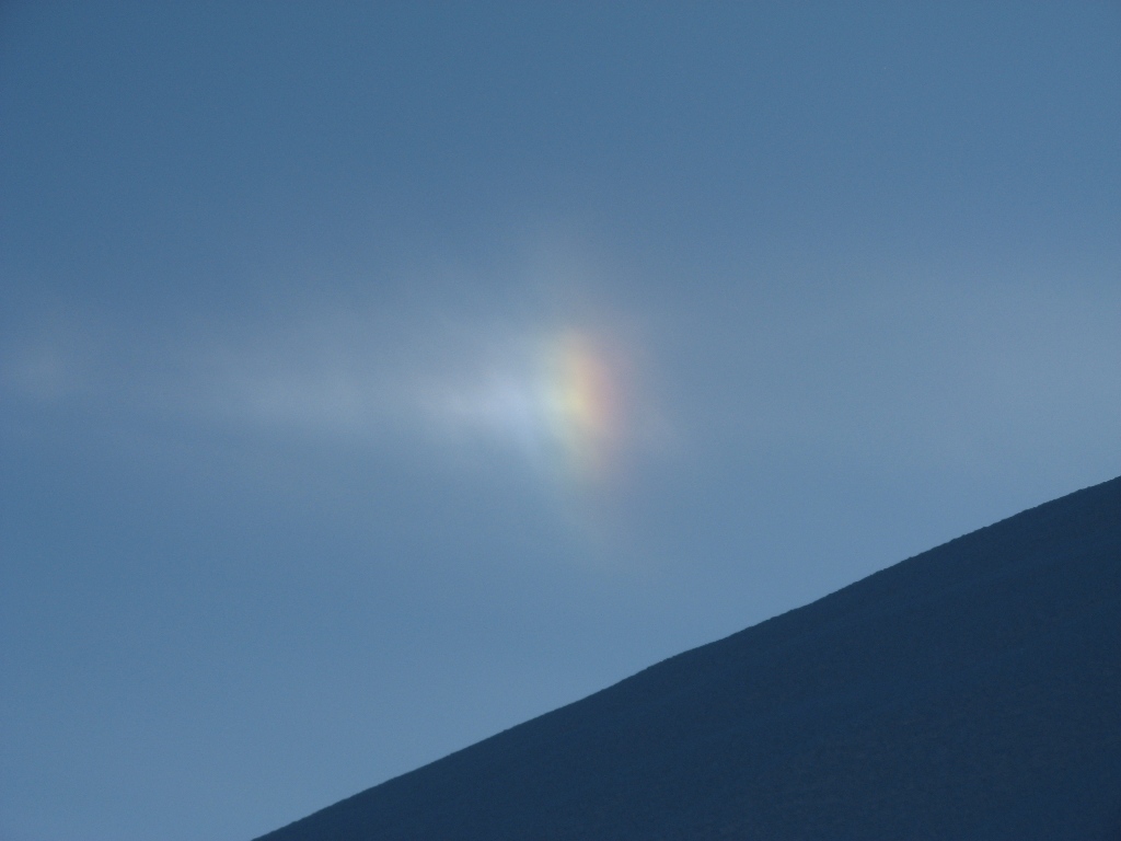 das nennt man Halo, leider nur ein Stück davon, da die Wolke nicht durchgängig war, sonst hättest du einen ganzen Kreis gesehen
