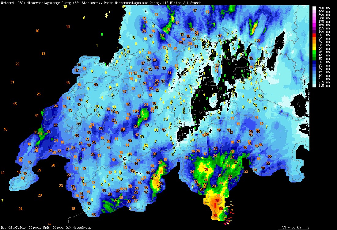 So gut wie keine, da La Dole und Plaine-Morte den Aargau gut abdecken und ab 17:50 Uhr der Albis wieder lief. Zudem zeigt die Karte mit den Bodenmesswerten, dass kaum mehr als 30 mm gefallen sind. Die Messstation Buchs-Aarau befindet sich mit 25 mm ja sehr nahe bei dir.Bulilu hat geschrieben:Welche Auswirkung hat der fehlende Albisradar auf meine Region (Suhr) in welcher zwischen 25 bis 30mm gemessen wurden?