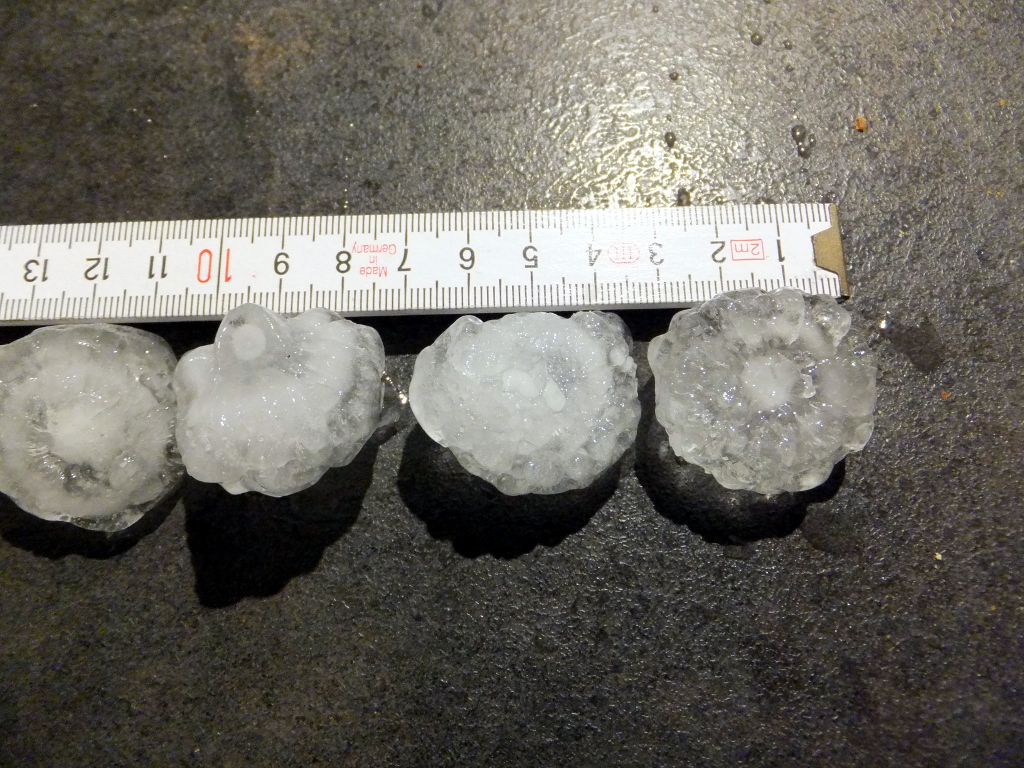 Hier ist die erste Runde durch. So wie es aussieht, war es genau ein Volltreffer auf Freiburg. Bei mir in der Ecke (Südwestrand der Stadt) gab es fast reinen Hagel und nur wenig Regen. Auch Wind war kein Thema. Viele Hagelkörner sind beim Aufprall zerbrochen, aber ein paar habe ich als Bild festgehalten: