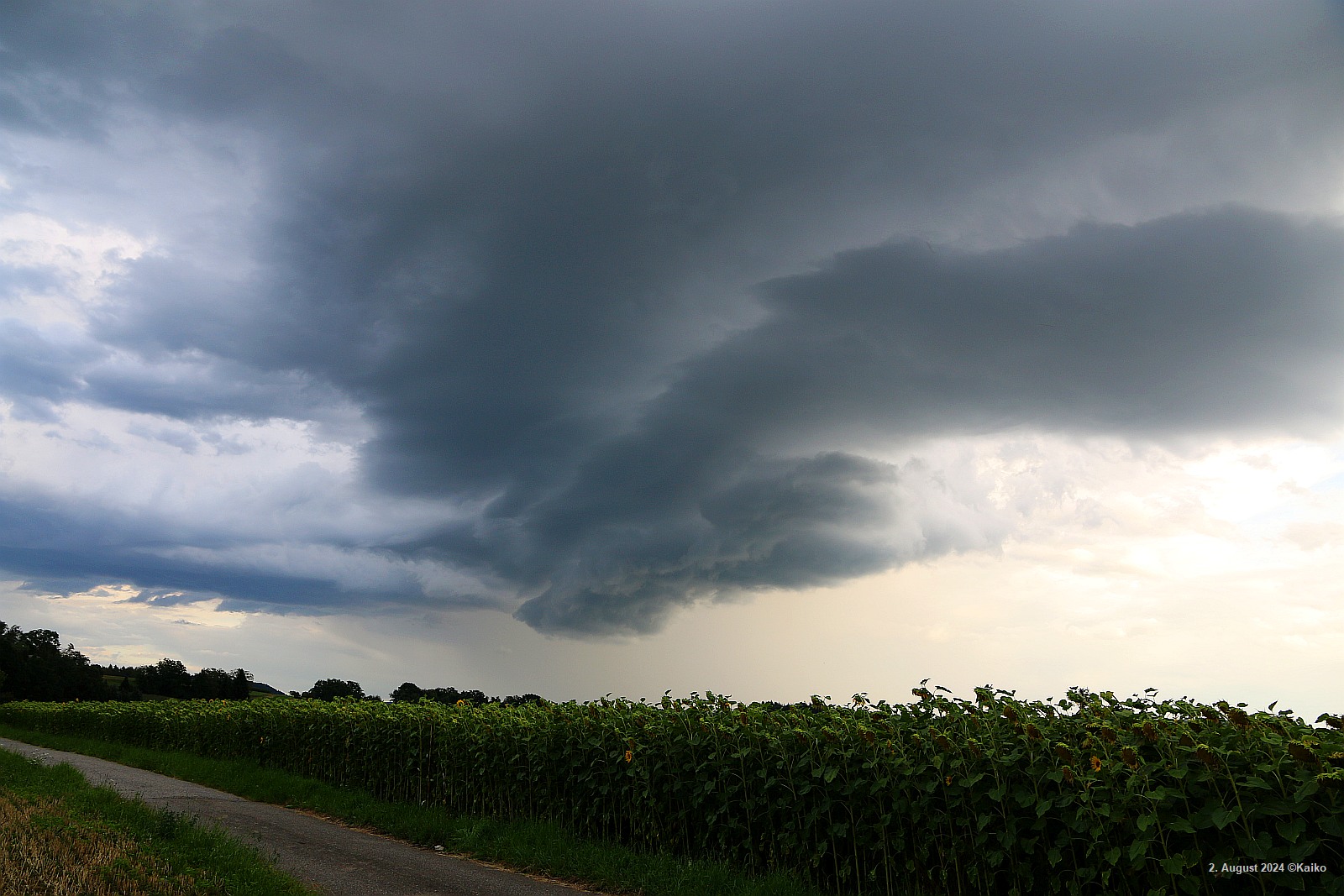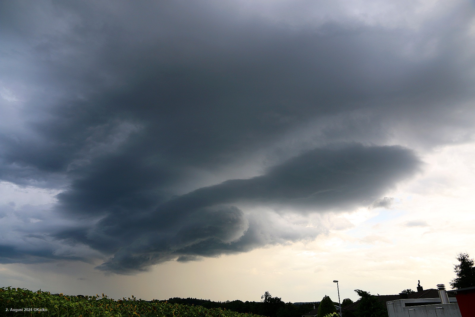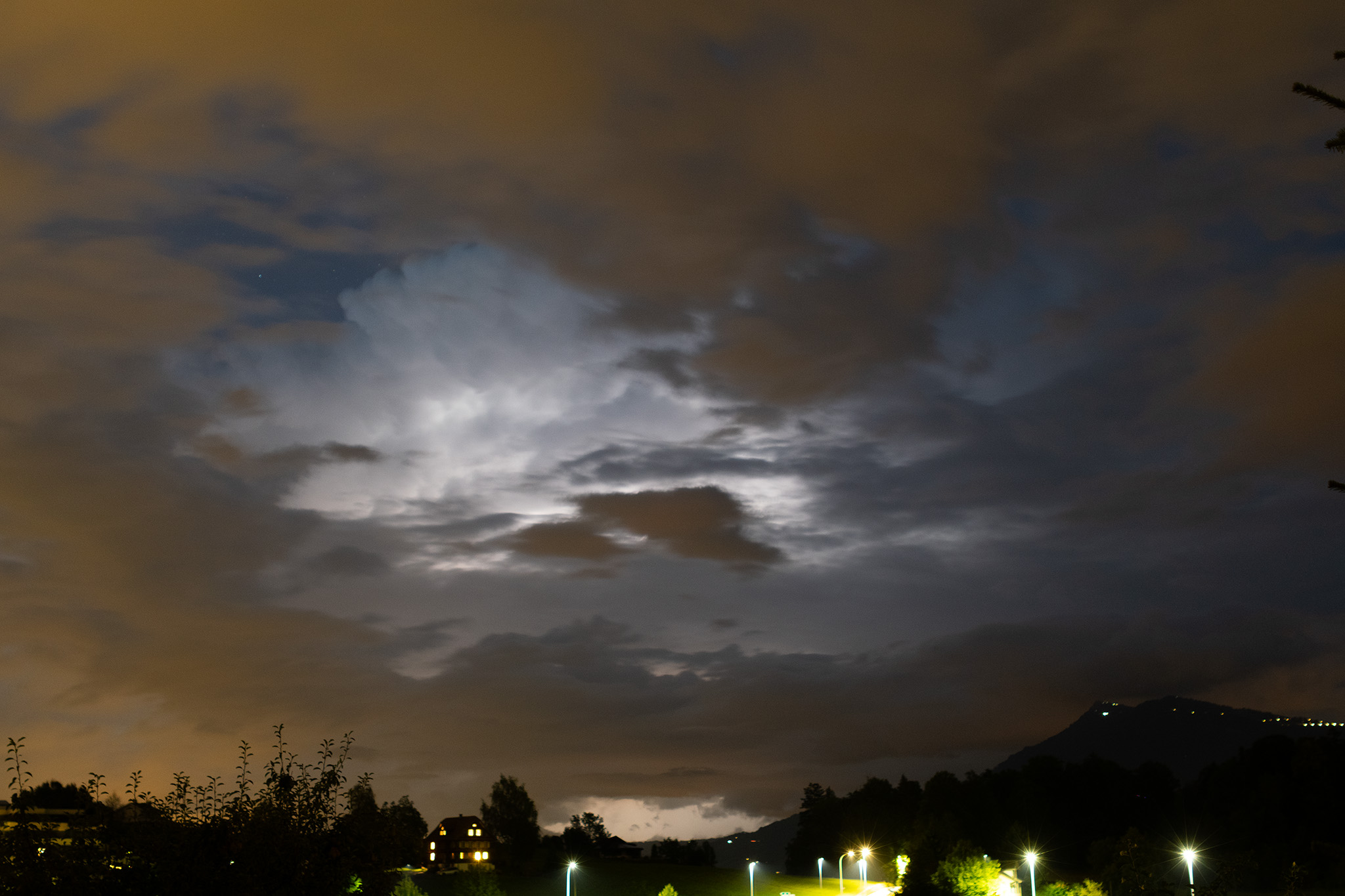 Vom Nachtessen in Bad Zurzach über den Zurziberg zurückkommend sah ich im Süden am Horizont um 19.45 Uhr die Strukturen dieser Gewitterzelle am Himmel.