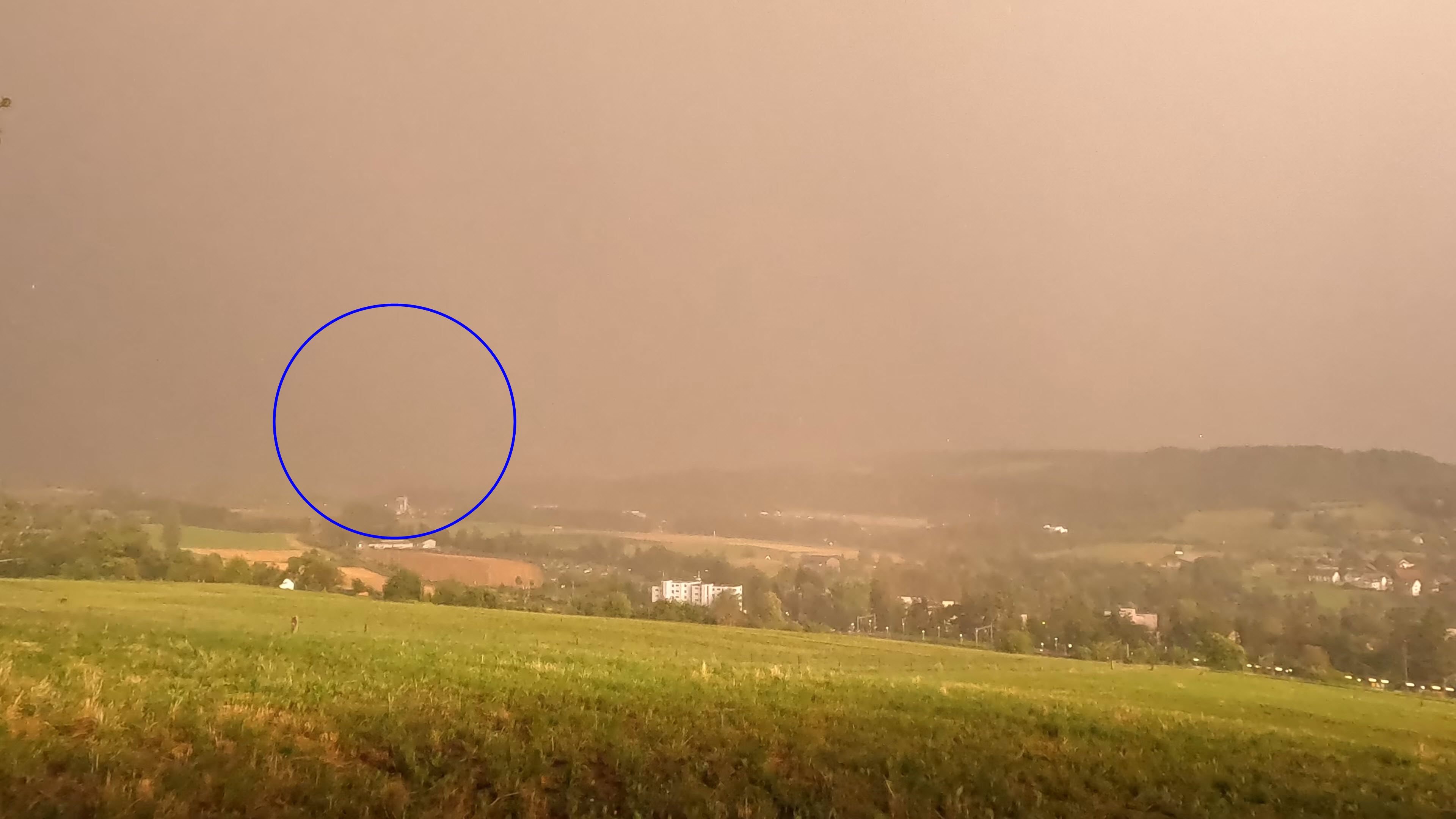 Desweiteren könnte man argumentieren, dass der Niederschlag den Blitz verdeckte. Das wäre zwar möglich, aber auch hier müsste ich einwenden, dass der Blitz auf diese Distanz (Distanz zum Einschlag ca. 2.8km bei einer Sichtweite von mind. 2.2km) trotzdem erkennbar sein müsste. Der Niederschlag war zwar stark, aber nicht so stark um das Licht des Blitzes komplett zu verschlingen. Daher lege ich mich fest und behaupte: Das war kein Erdblitz.