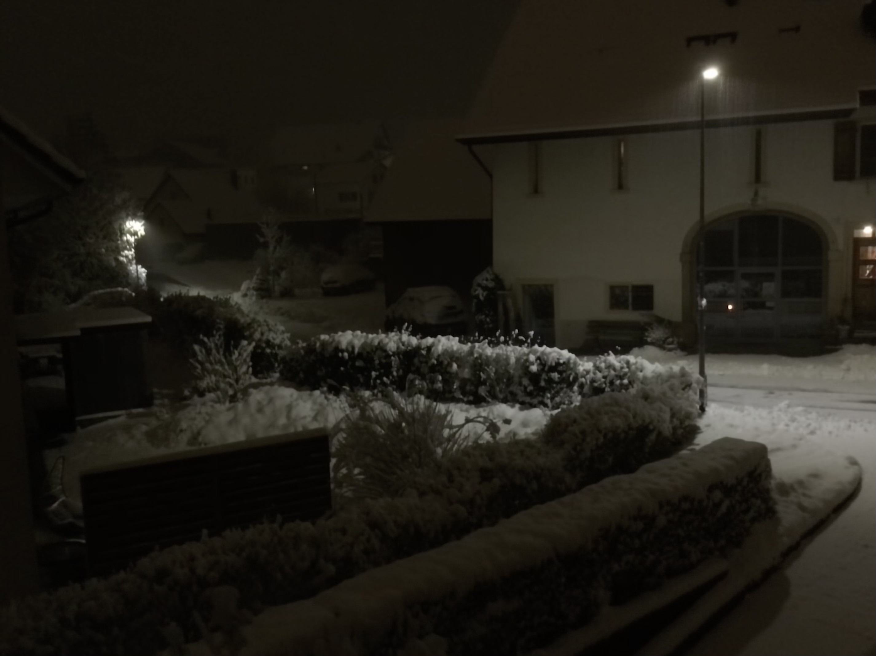 Basel hat den Rekord für die höchste Schneehöhe im November seit Aufzeichnungsbeginn geknackt. Binningen meldet 17 cm (automatisch). Auch hier in der Stadt bei mir sind es nur unwesentlich weniger ca. 15 cm und es schneit immer noch sehr stark weiter. Da kommt auch noch einiges nach. Schon zuviel des Guten, der nasse Schnee. Ich muss immer wieder raus. Schnee von den Pflanzen abschütteln. Ein Ast ist mir schon von der Schneelast abgebrochen. Ungalublich!