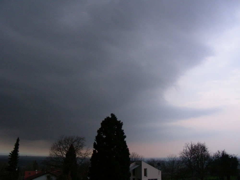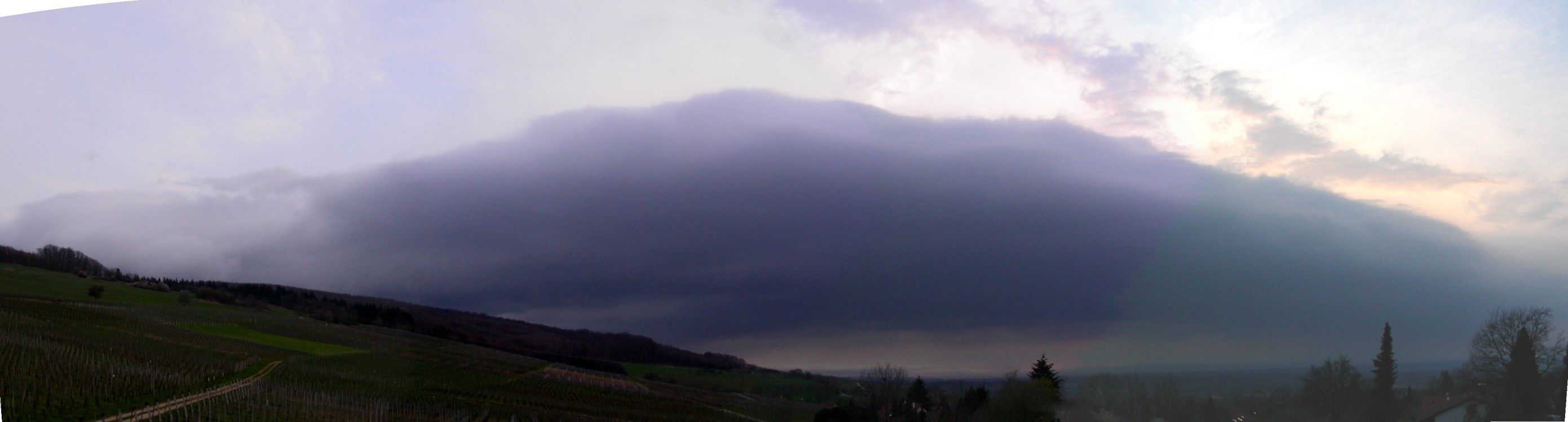 Diese entkoppelte Böenfront (oder was es war?) rauschte recht schnell heran und erstreckte sich mittlerweile (8min später) über den gesamten Rheingraben, wie weit sie in den Schwarzwald ragte kann ich nicht beurteilen. Da die Sonne verdeckt war, entstand das folgende Panorama unter schlechten Lichtverhältnissen (s. rechter Bildrand). Aber die Formation kommt denke ich trotzdem ganz gut rüber: