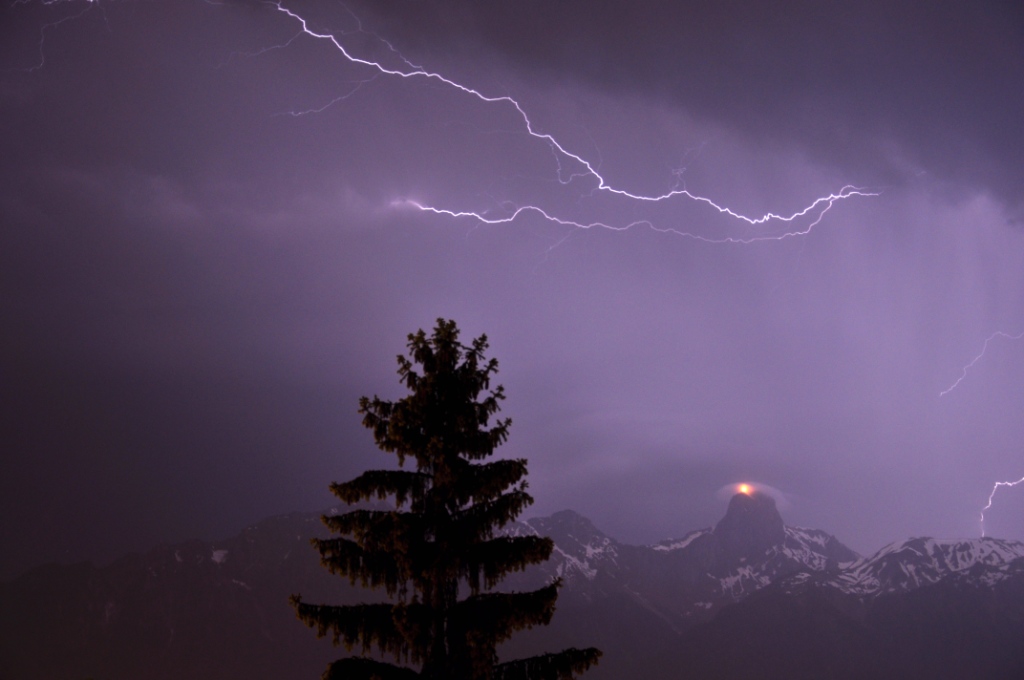 Kurz nach Mitternacht über der Stockhornkette munteres Geflackere. Ganz wie gewünscht hat's noch nicht geklappt, aber immerhin: Der Schnee ist am Montag gefallen, bis 1000 m.ü.M. Stockhorn mit Pileus: