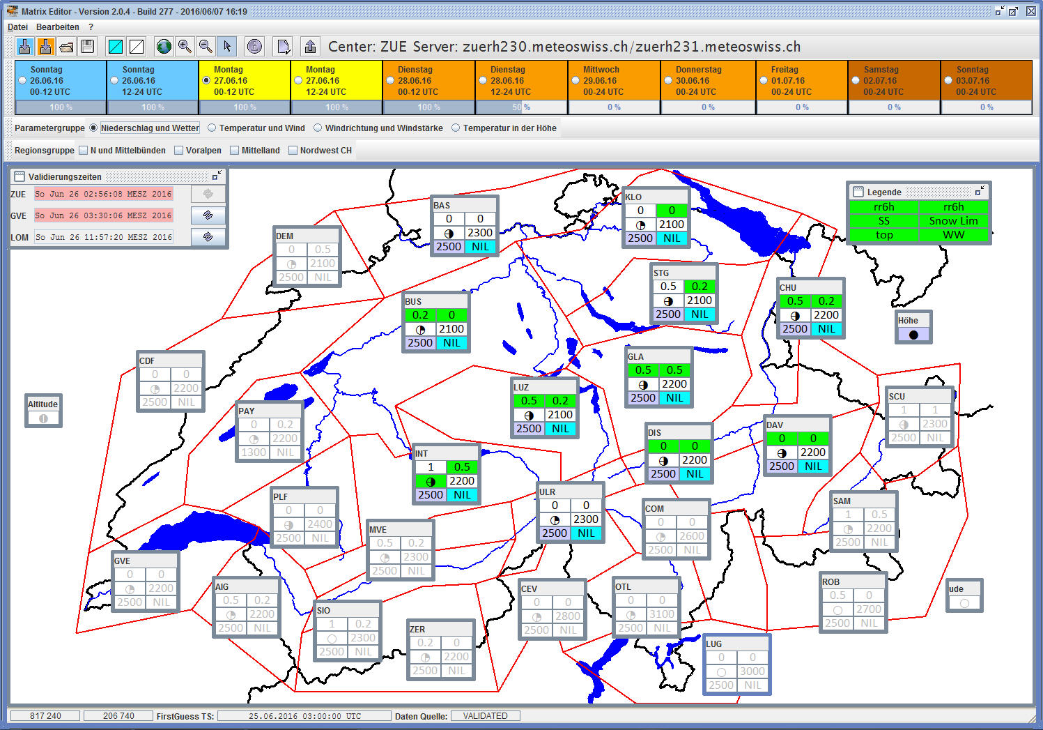 Prognosen (wir nennen es "validierte Prognose") für diese 10 bis 30 Standorte werden dann mit komplexen Algorithmen auf sämtliche Postleitzahlen der Schweiz im Raum inter- und extrapoliert, dabei wird die probabilistische Information des EPS bspw. für die Temperaturkurve auf den streng deterministischen validierten Wert aufgeprägt und geht so auf die App und die Website. Hier ein Screenshot unseres Prognoseeditors, in welchem ich die deterministischen Punktprognosen für die Deutschschweiz mache, welche Basis für alle abgeleiteten Produkte bilden: