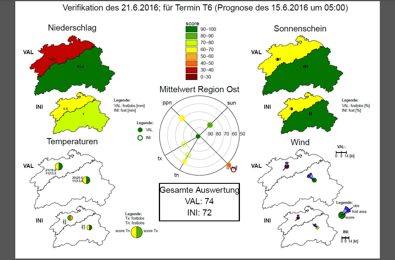 Dargestellt sind die wichtigsten vier Prognoseparameter Niederschlag, Sonnenschein, Temperatur und Wind. Klein ist immer der INI, mein dannzumal zur Verfügung stehender First Guess, sowie meine punktuell leicht korrigierte, validierte Handprognose (VAL). Die Zielscheibe in der Mitte ist die Gesamtschau dieser Prognose: Je näher das Kreisli im Zentrum, desto besser die Prognose. In diesem Beispiel habe ich den Wind verbessert, die Tiefsttemperatur und den Niederschlag aber verschlechtert, was netto in einer Degradierung des First Guess resultierte.
