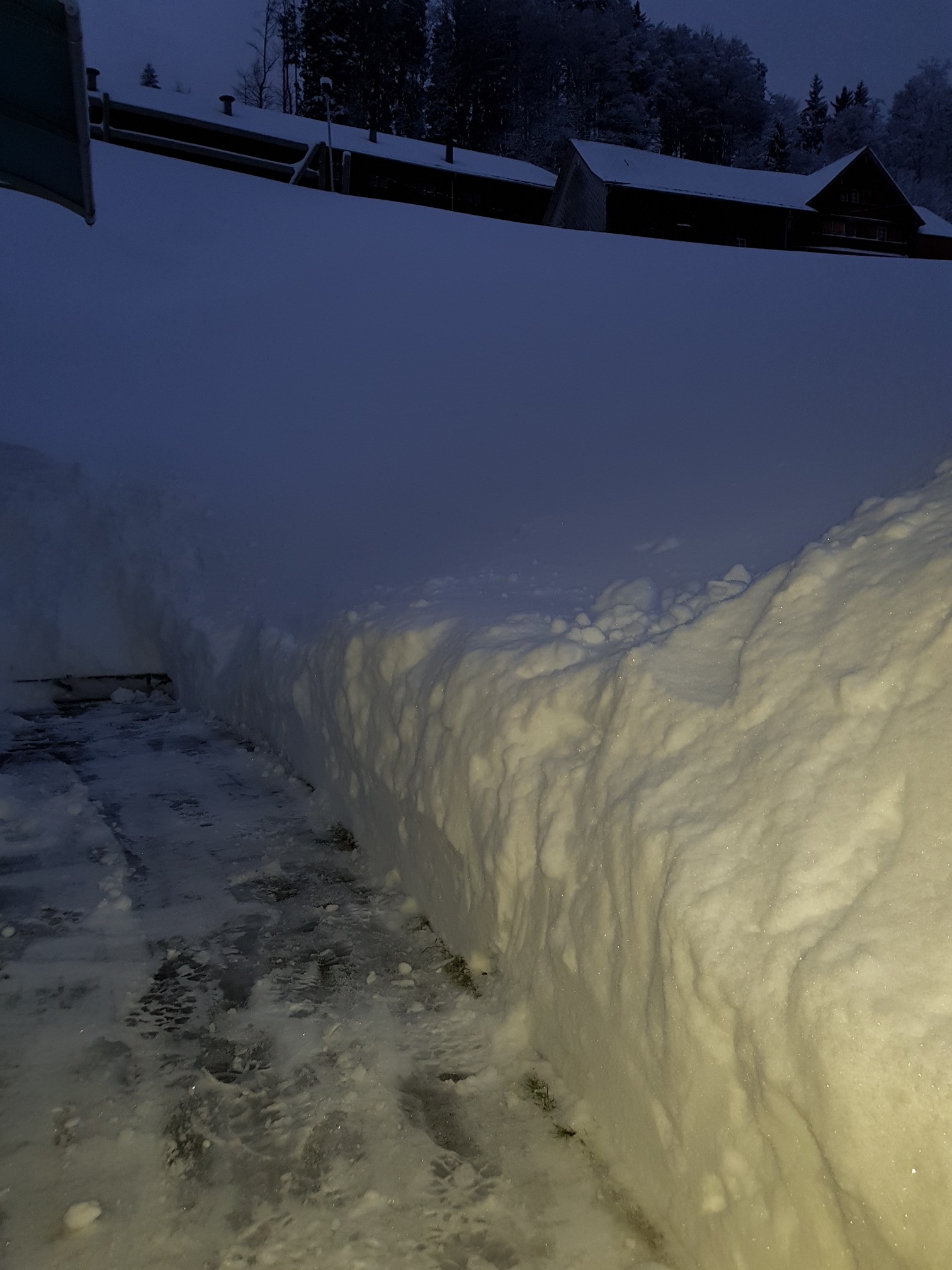 Hier im oberen Tösstal auf 800 m gab es mind. 20 cm Neuschnee seit gestern Abend 19 Uhr, dies aus > 10 mm, Niederschlag. Station HOE mit 14 mm von 02.30 bis 14.30 Uhr und 7.1 mm von 08.30 bis 14.30 Uhr, wobei hier ev. dieses Mal etwas zuviel in den Topf gelangte...
