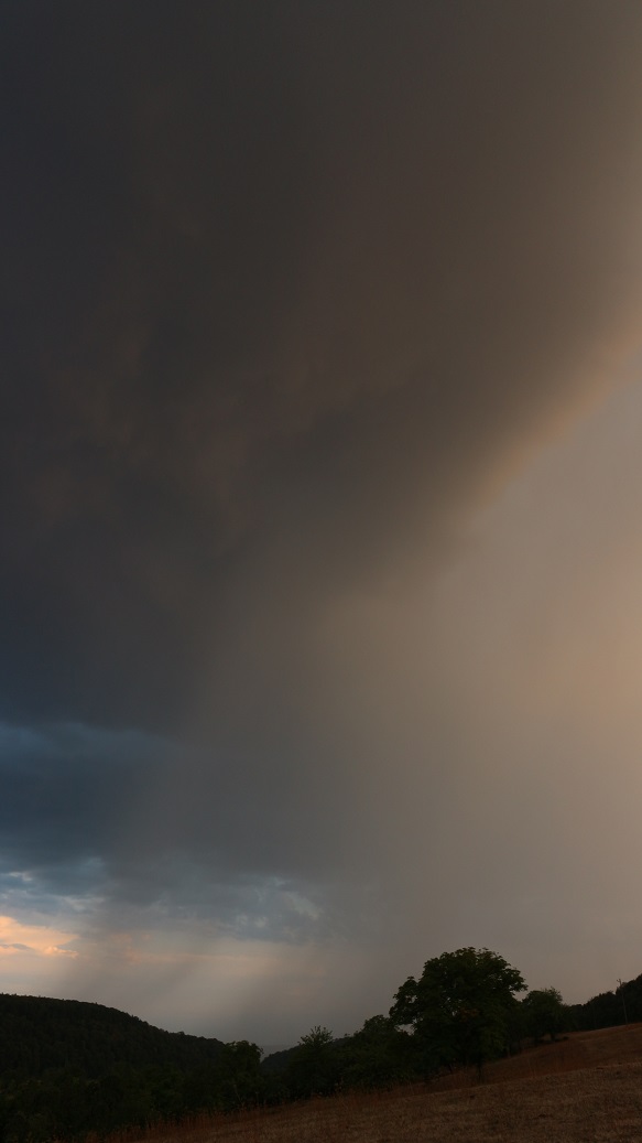 Tornado halte ich für unwahrscheinlich. Die recht hochbasige Zelle sieht auf der roundshot Webcam Bäumlihof zu dem Zeitpunkt eigentlich schon sehr mager aus. Aber das Bild von 19.10 Uhr sieht nach (wet) downburst aus, bei dem Schnappschuss sieht man die typische Beule mit auswehen in Bodennähe. Ob das zeitlich und örtlich hinkommt?