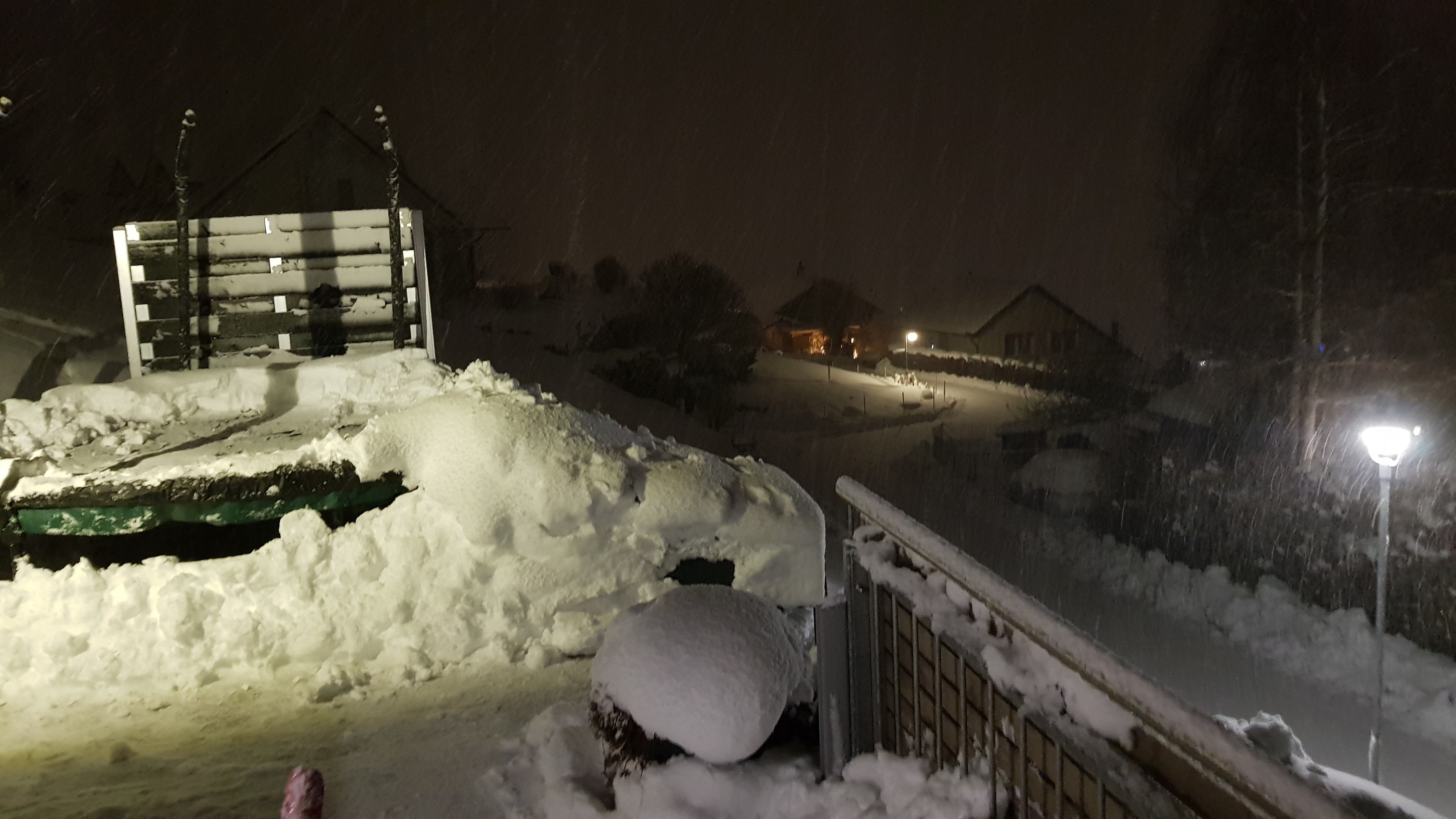 Morgen hier hat es bis 6.00Uhr 15cm Betonschnee gegeben,am schluss war es Schneeregen bei einer temp.bei 0,7Grad.Seit 6 Uhr wieder intesiver Schneefall und sinkende temperaturen.
