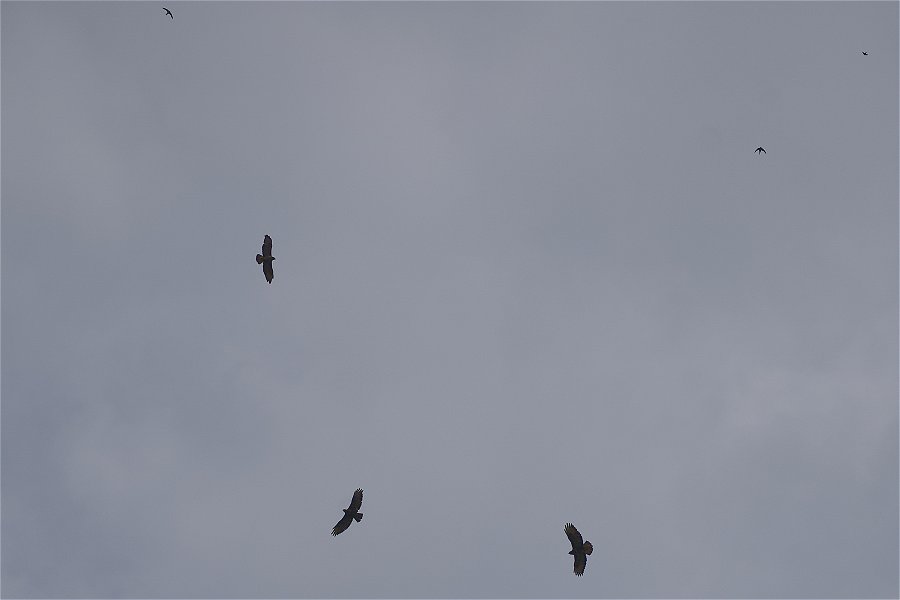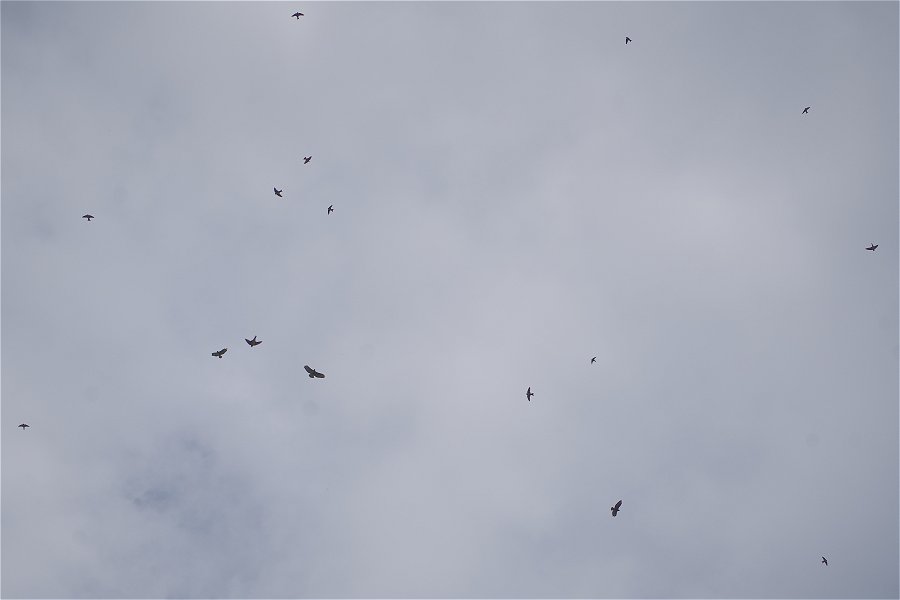 Heute Mittag kreisten 3 Rotmilane direkt über meinem Kopf immer höher in den Himmel. Dabei kamen Mauersegler* hinzu. Das Schauspiel war eindrücklich, ich hätte jedoch besser gefilmt als geknipst. Anbei 3 von vielen Schnappschüssen. Die Lichtverhältnisse waren nicht ideal. Der Kontrast vom bewölkten Himmel zu den dunklen Vögeln war extrem und konnte durch die Kamera nicht erfasst werden.