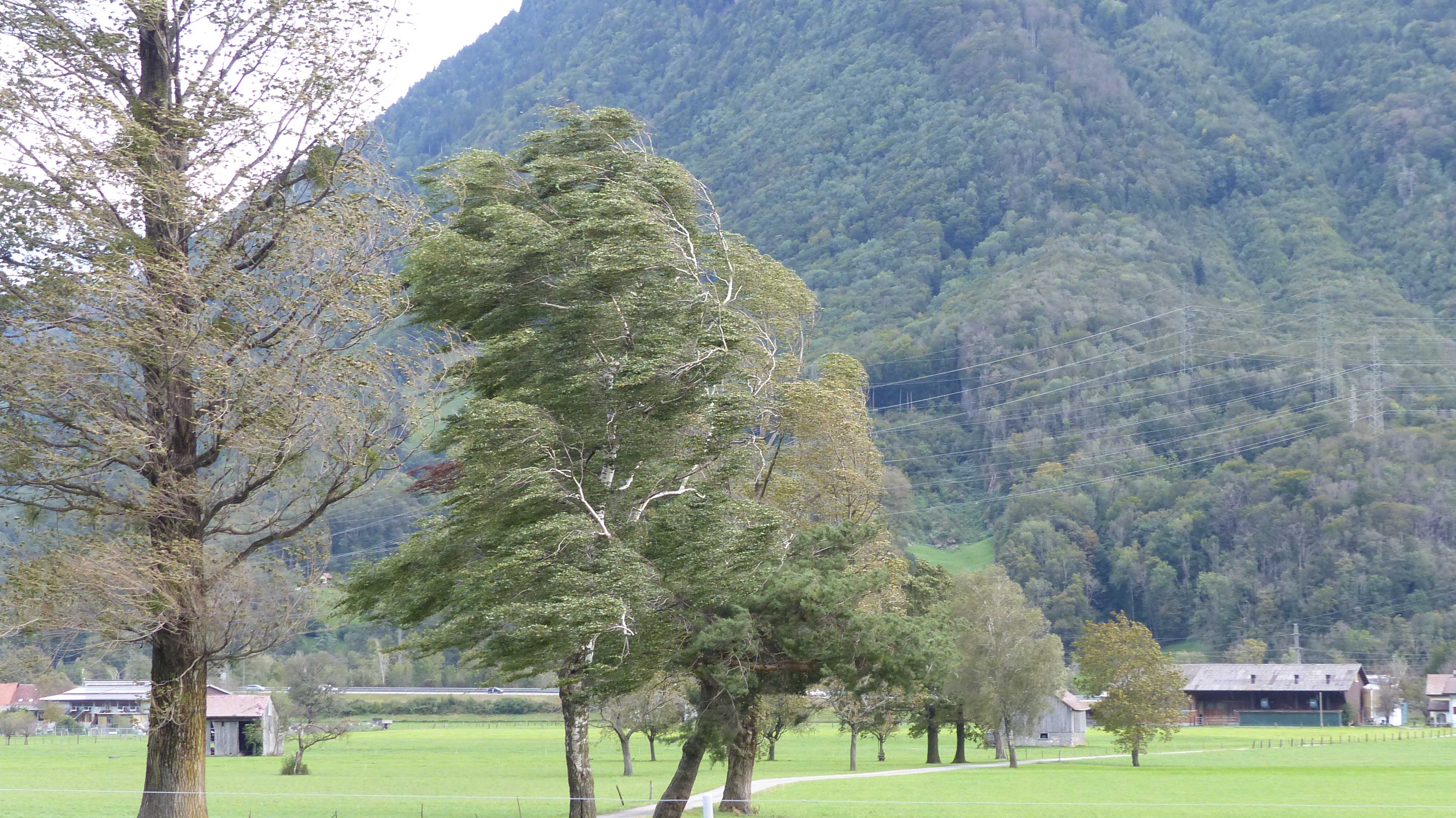 Ich versuchte die Windstärke mit diesem Baum ins Bild zu bringen. Das ist beim Industriegebiet Unter Fänen zwischen Bilten und Niederurnen.