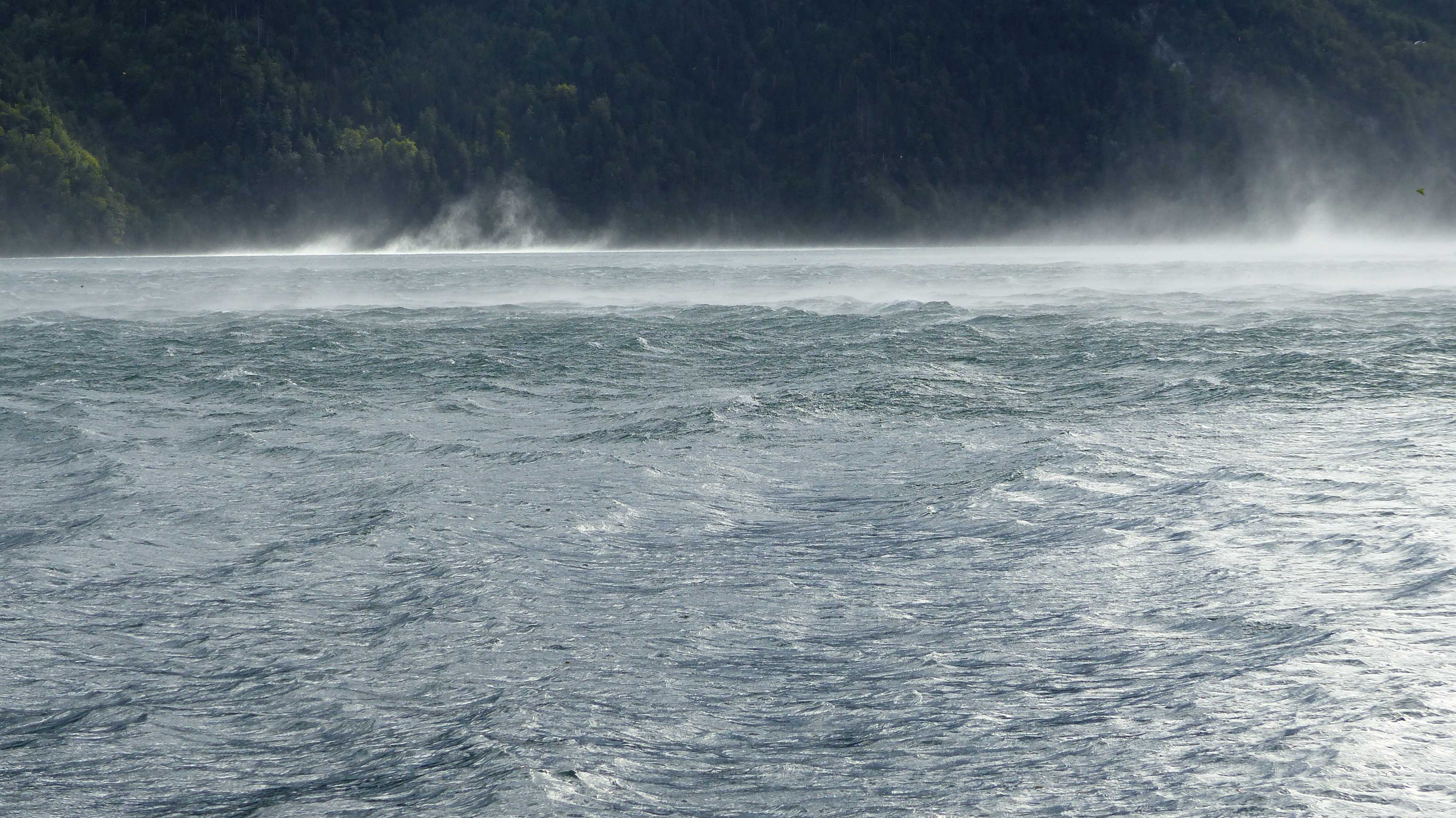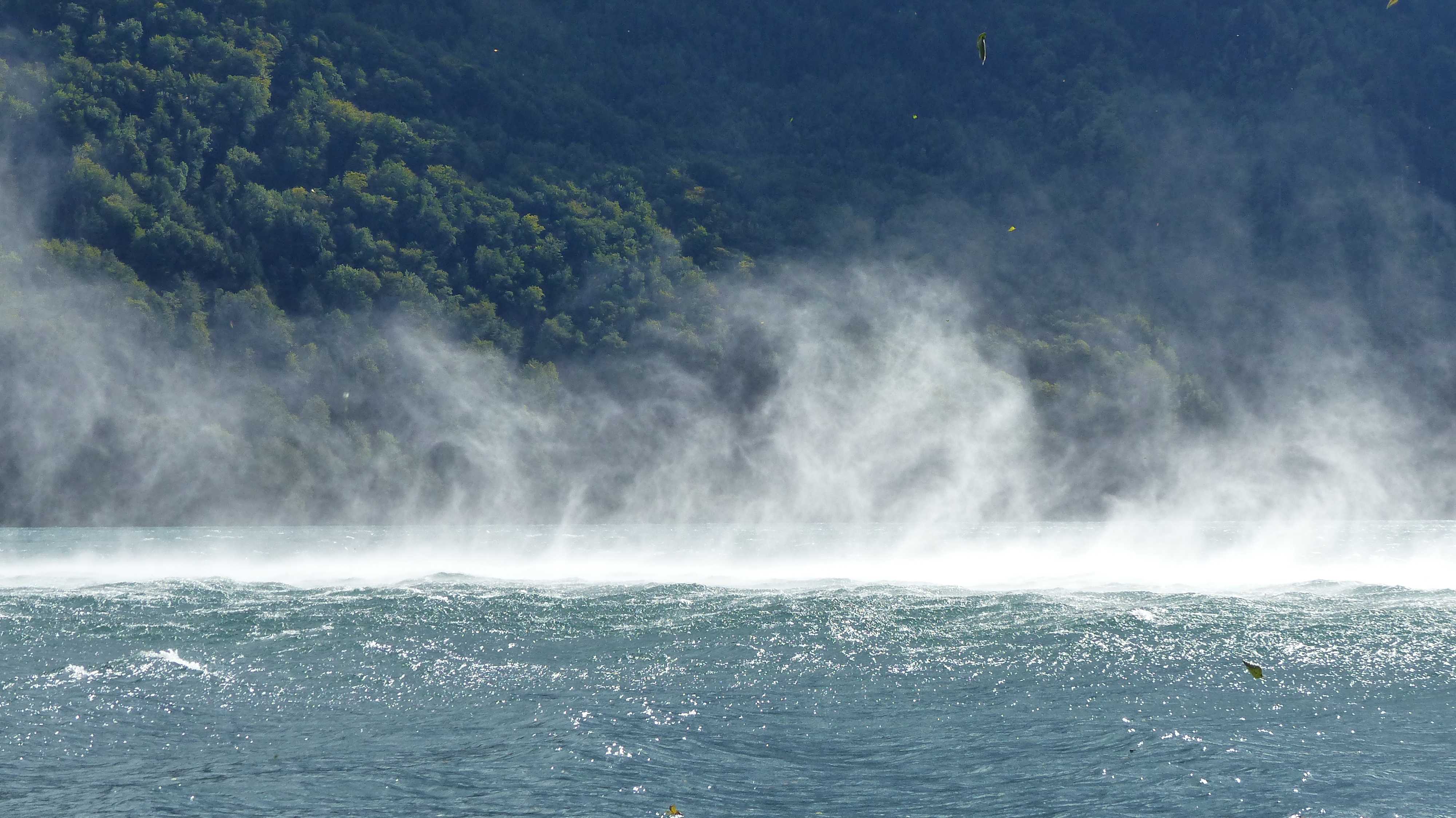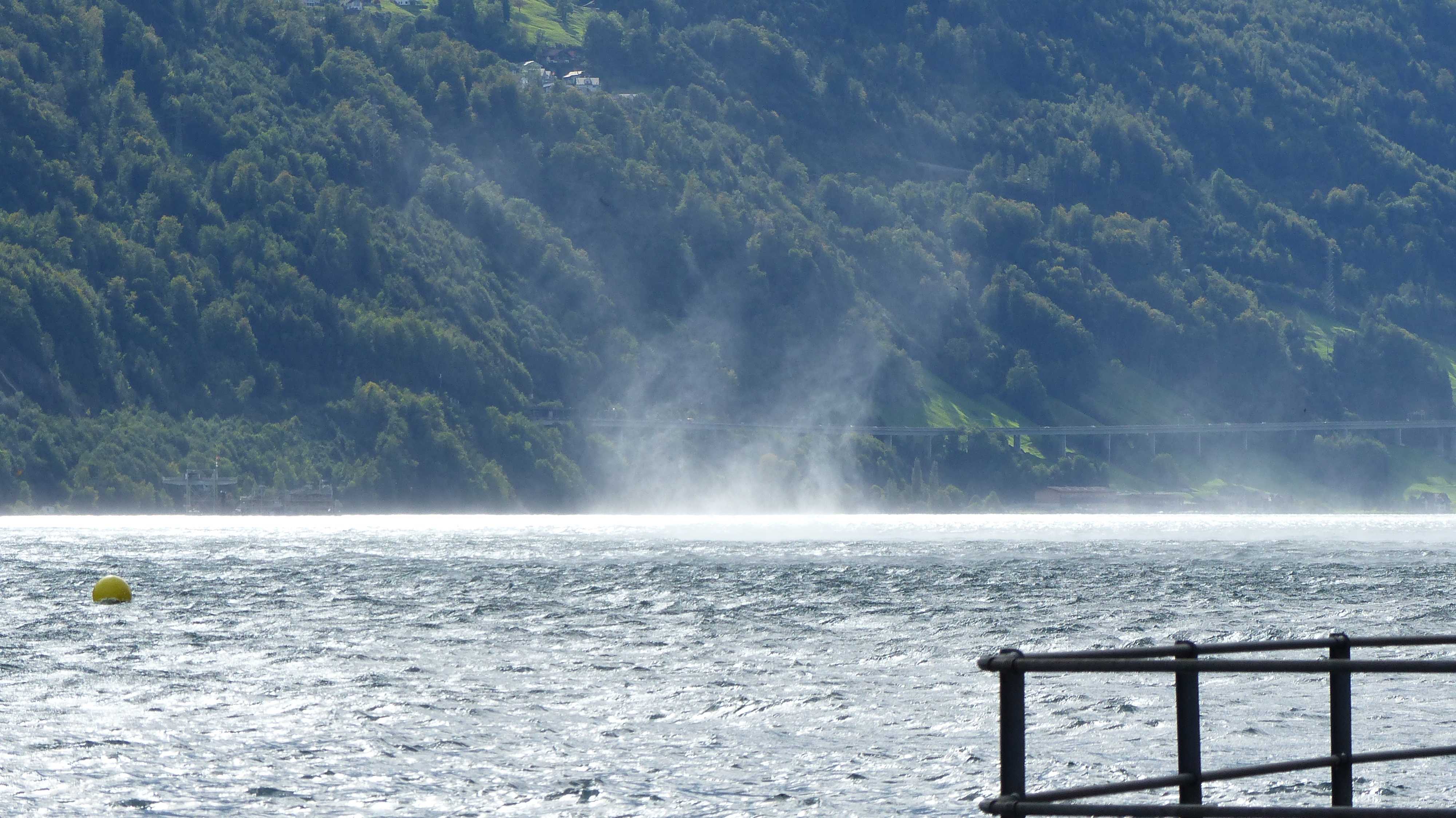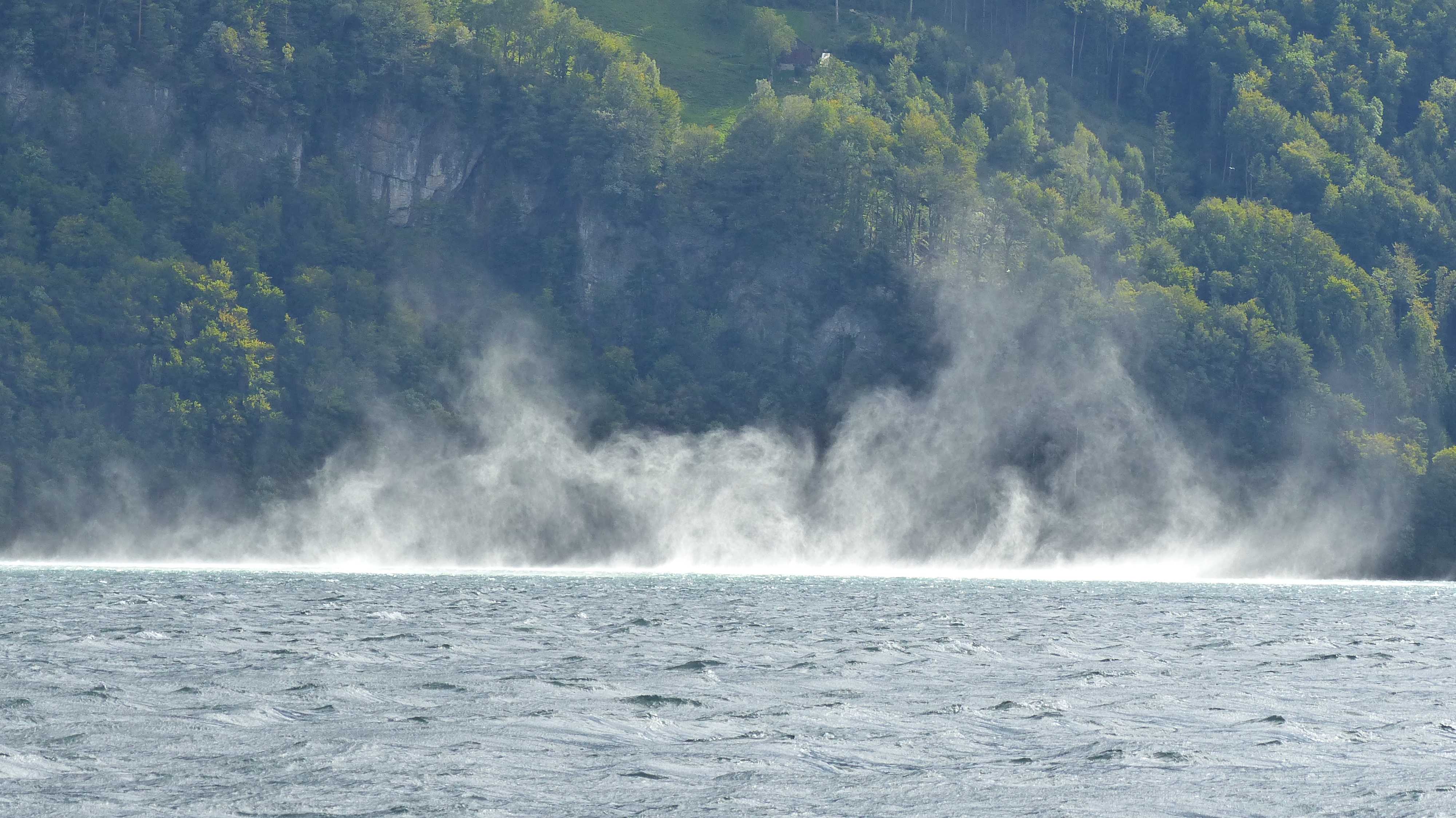 Ich fuhr weiter Richtung Brunnen. Beim Föhnsturm von heute war es in Brunnen etwas ruhiger. Es gab recht hohen Seegang, der Wind hielt sich in Grenzen. Darum fuhr ich weiter und machte Halt zwischen Brunnen und Gersau beim Seebad Kindli. Die Darbietung hier war der absolute Höhepunkt des Tages. Das Spiel des Föhns mit dem Wasser ist einfach faszinierend und eindrücklich. Ich lasse ein paar Bilder sprechen.