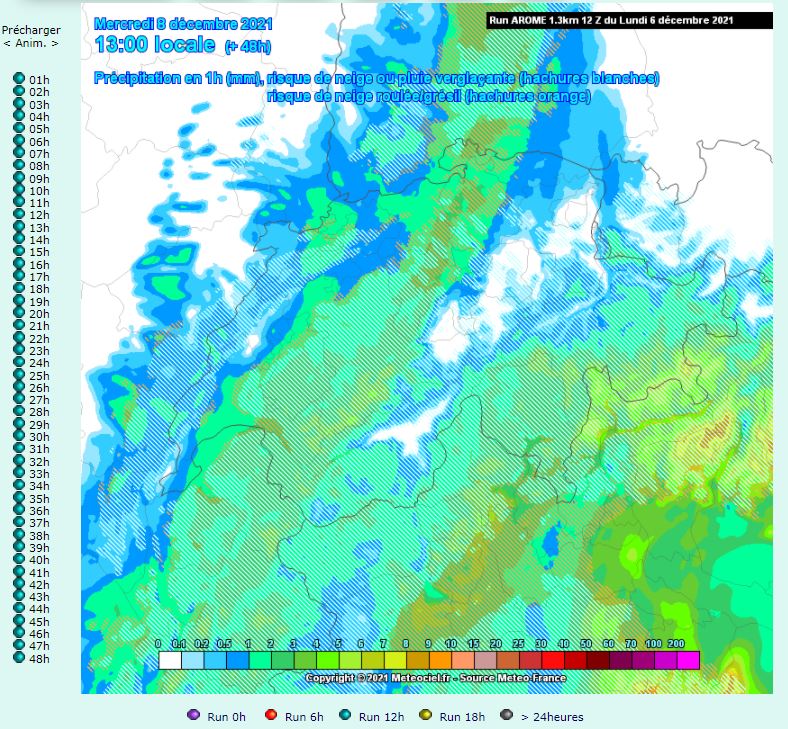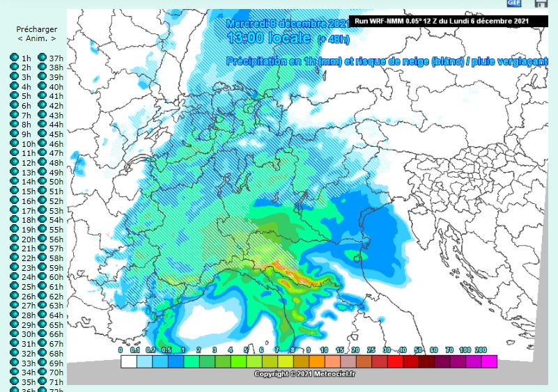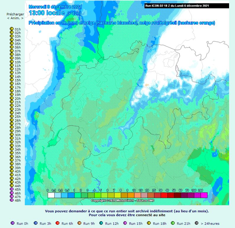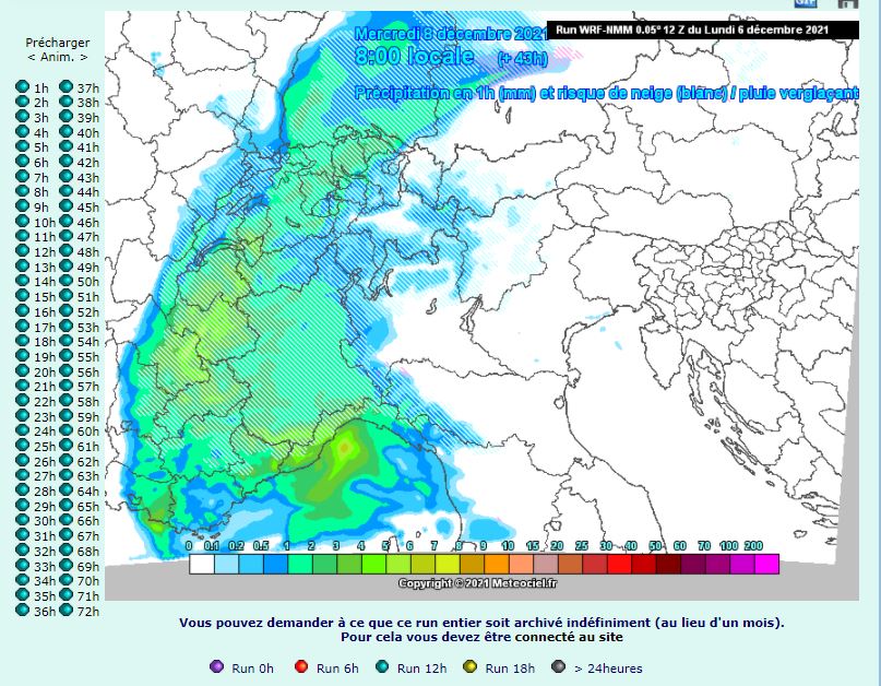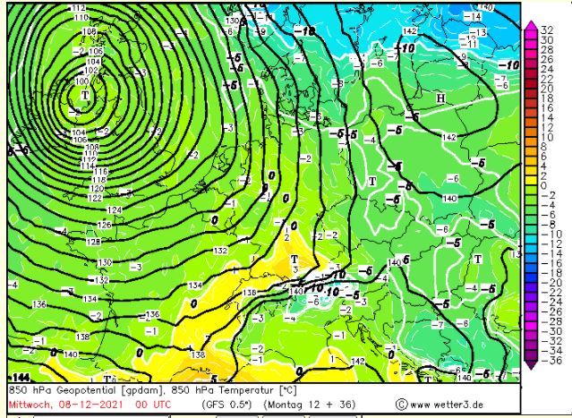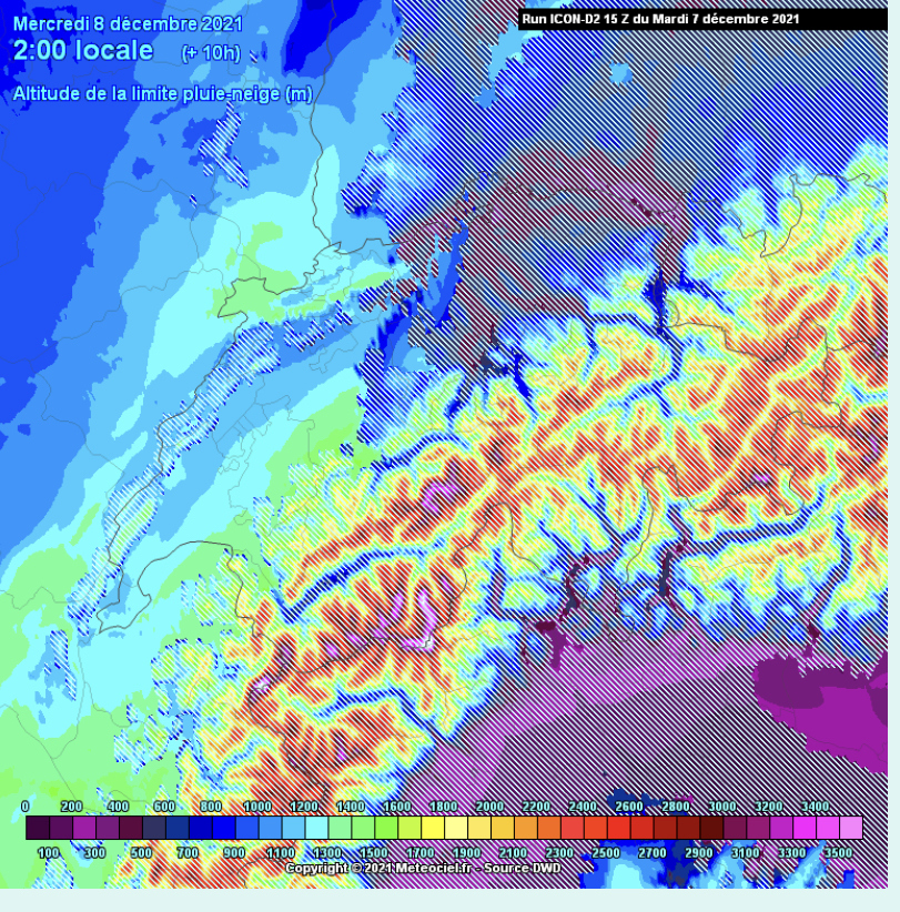 Die Karten von ICON-D2 sind ein Traum, jedoch mit äusserster Vorsicht zu geniessen...Markus Pfister hat geschrieben: ↑Di 7. Dez 2021, 12:25 auf der Alpennordseite könnte ab der kommenden Nacht bis Donnerstagmorgen 20 bis 40 cm Schnee fallen. Grund dafür ist ein langsam reinschwenkender und ins Mittelmeer ausgreifender Trog mit vorderseitiger Hebung und eher schwachen Winden bei uns. Das schaut nach relativ hoher Niederschlagsintensität (1mm/h) und damit absinkender Schneefallgrenze bis ins Mittelland aus. Über den Jura schwappt etwas milderer West- bis Nordwestwind, aber ob der weit ins Mittelland durchgreifen kann? Wrf 1x1 und Arome meinen eher ja, Icon-D2 eher nein. In der Folge ziehen auf der Rückseite des Trogs die nordwestlichen Winde wieder an und bringen noch etwas mehr Schnee, in den tiefsten Lagen mit neuerlicher Durchmischung wohl leider wieder knapp mit Schneedecke.