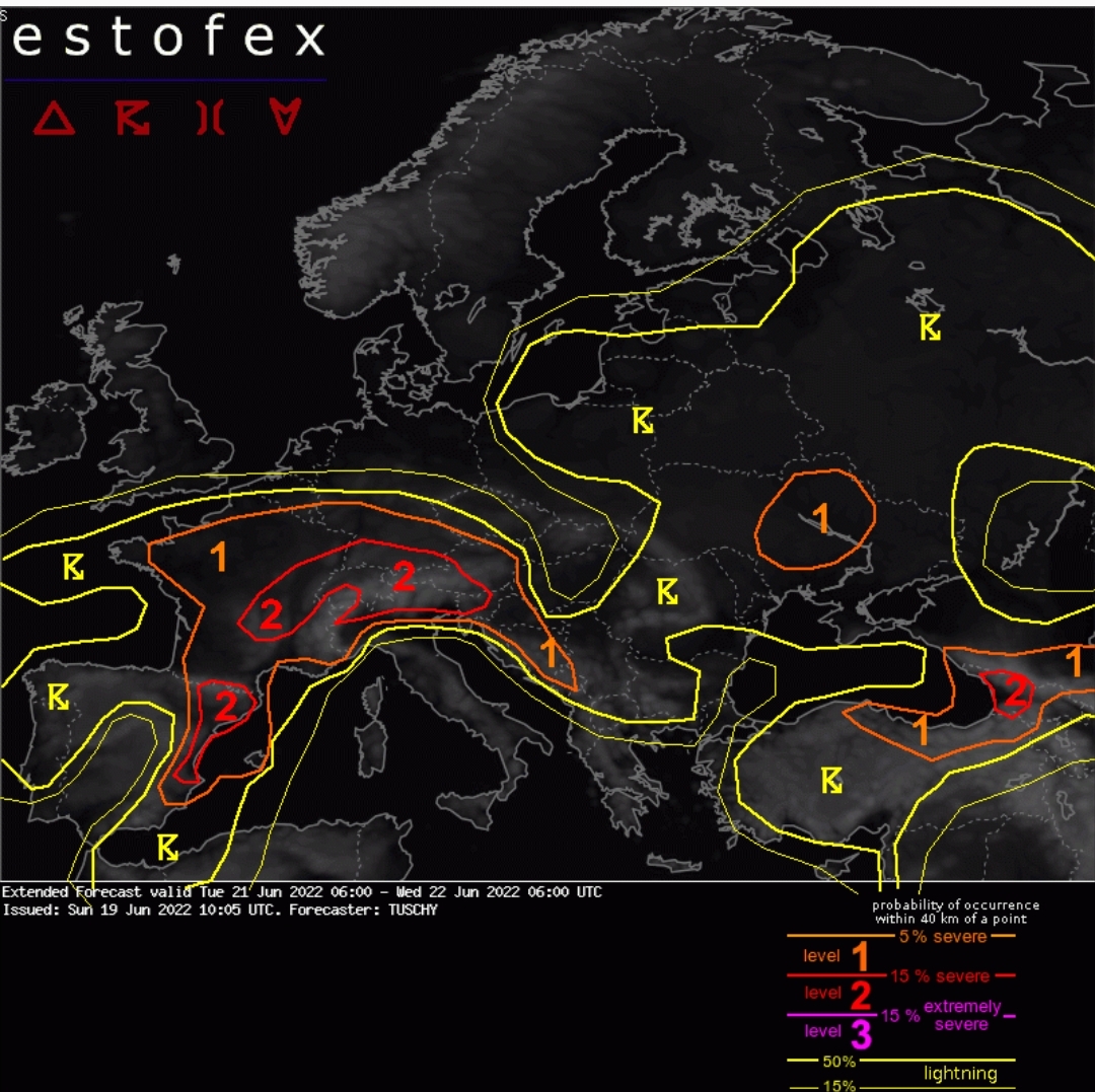 A level 2 was issued across Eastern Spain, France, parts of Switzerland, southern Germany, and northwestern Austria for (very) large hail, damaging winds, and to a lesser extent for heavy rainfall.