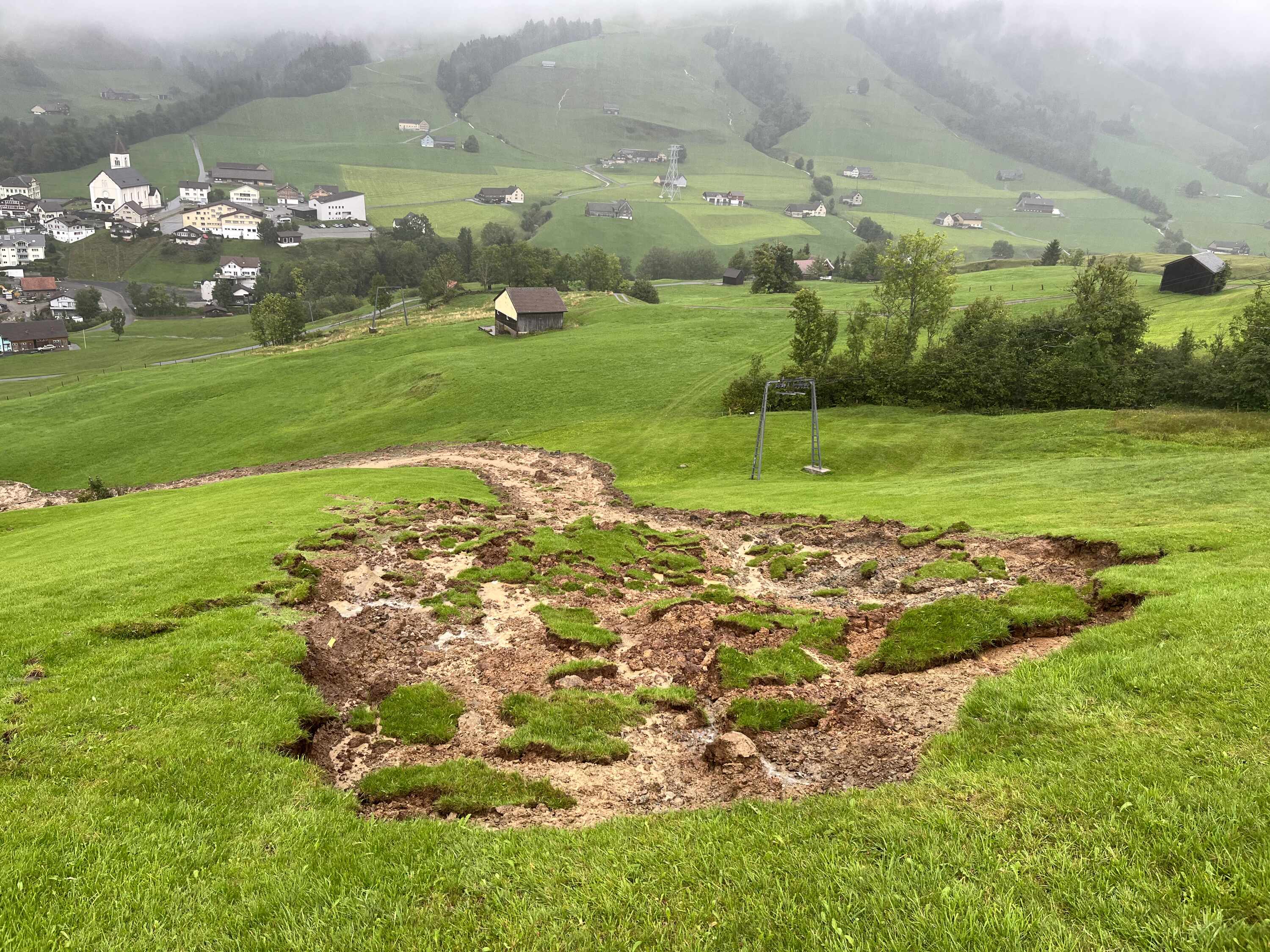 Unten rechts (im zweiten Bild) ganz klein im Bild sieht man einen ca. 5 Tonnen Steinblock, welcher fast ohne rollen aus unserer Weide runter ins Tal gerutscht ist.