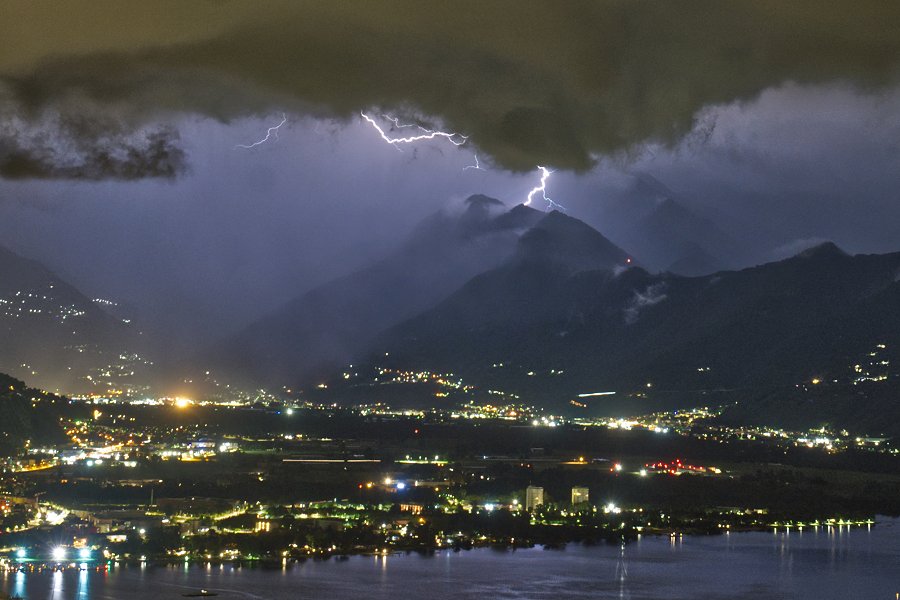 Am Abend gab es über dem Monte Tamaro schöne Quellungen. Es blieb jedoch bei schwachen Radarechos. Nach Mitternacht zog dann aus Süden ein blitzreicher Cluster vorbei. Alles in den Wolken, mit einer Ausnahme (Blick von Orselina gegen Osten in die Magadinoebene).