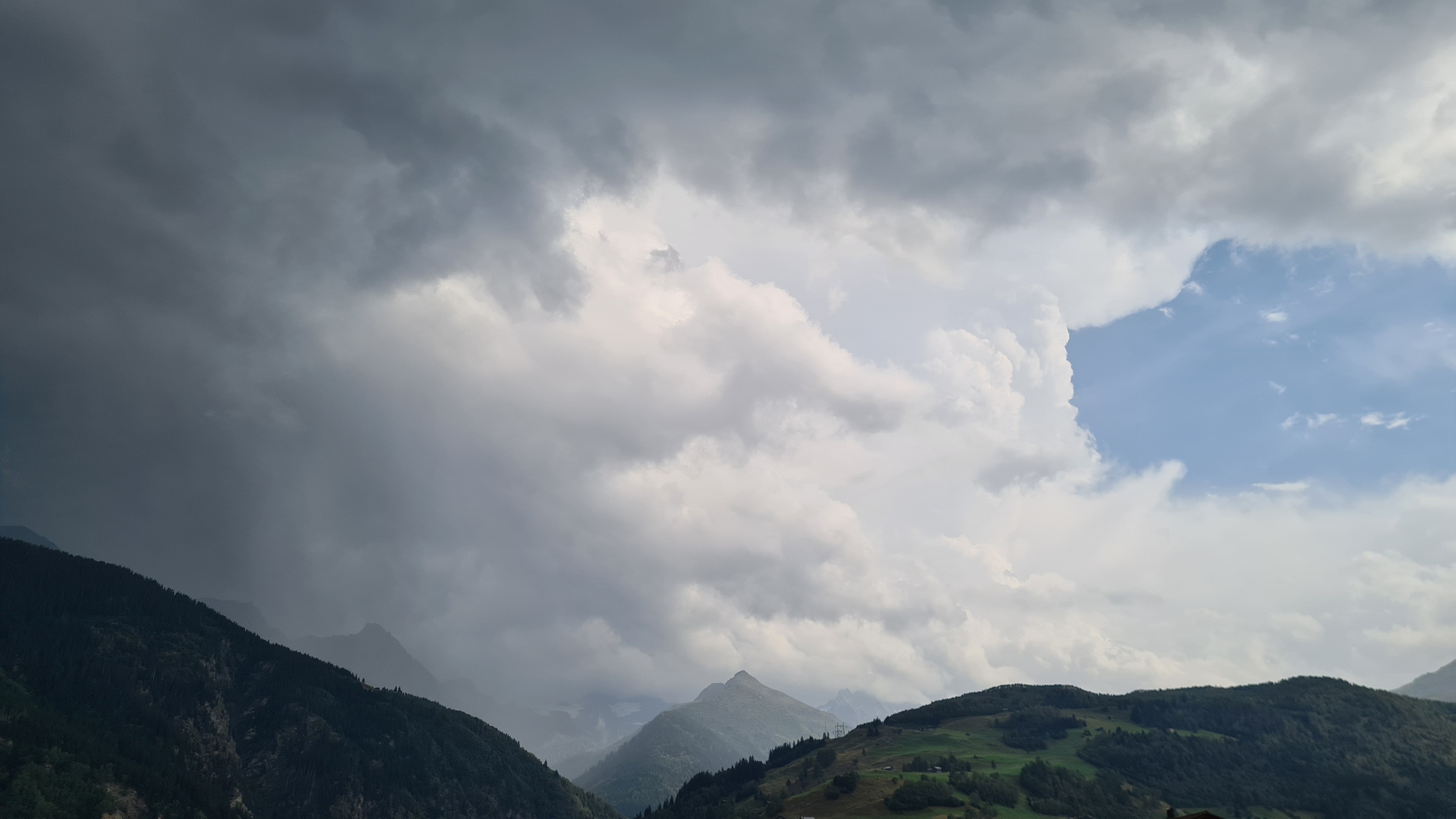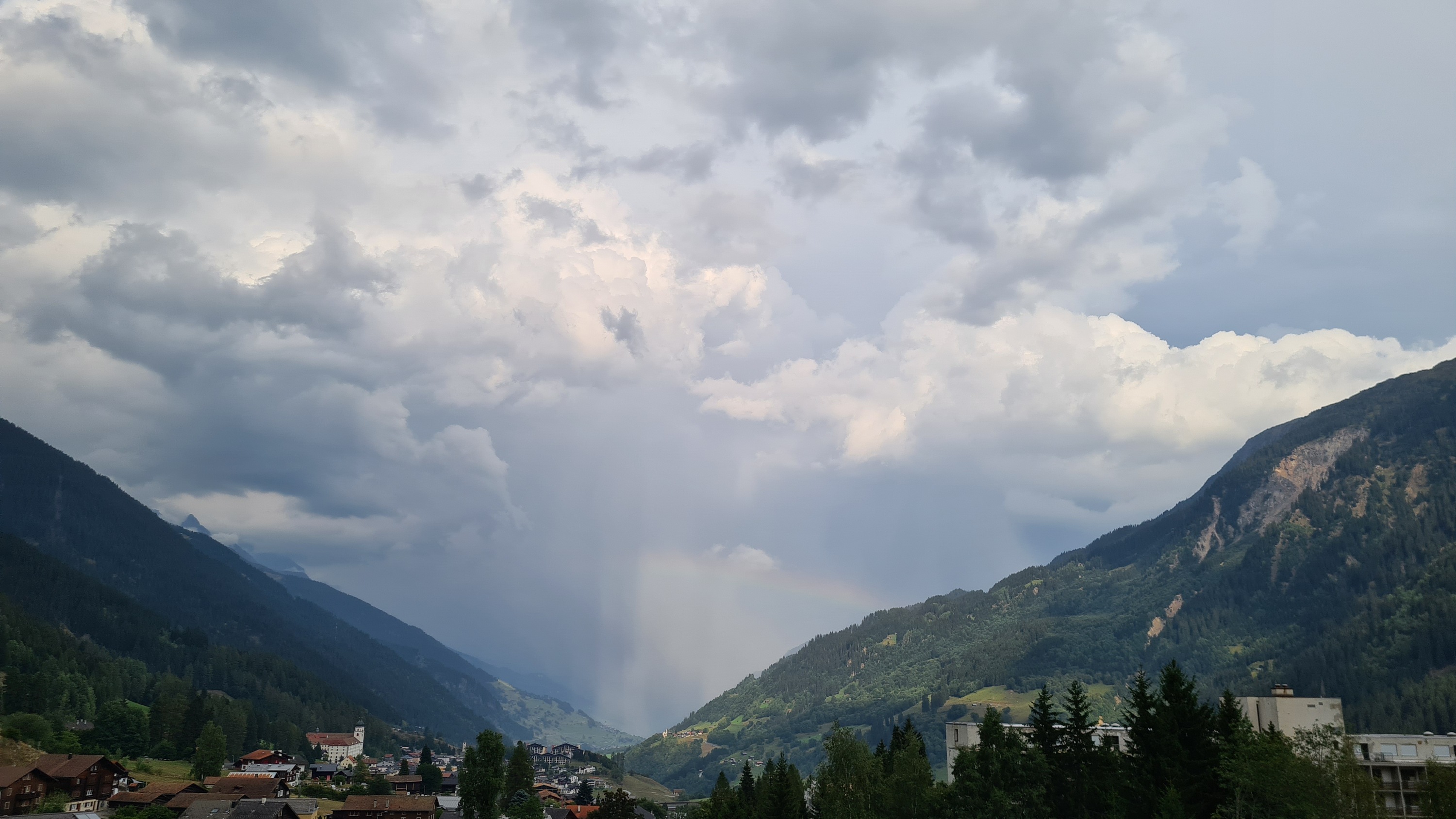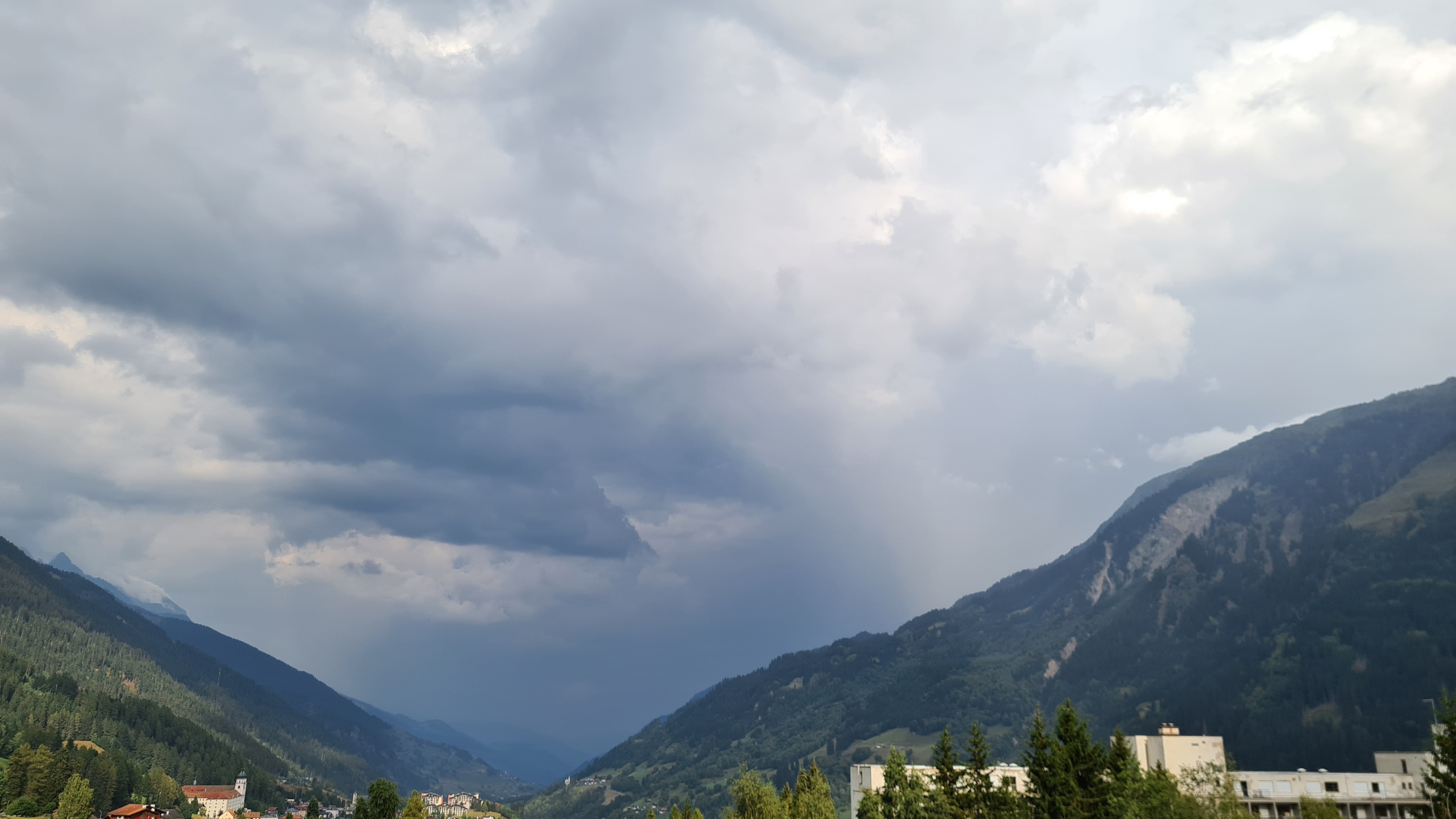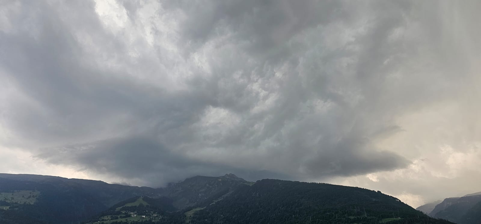 Böiger Bergwind (=Inflow) gerade in Disentis + 1. Donner