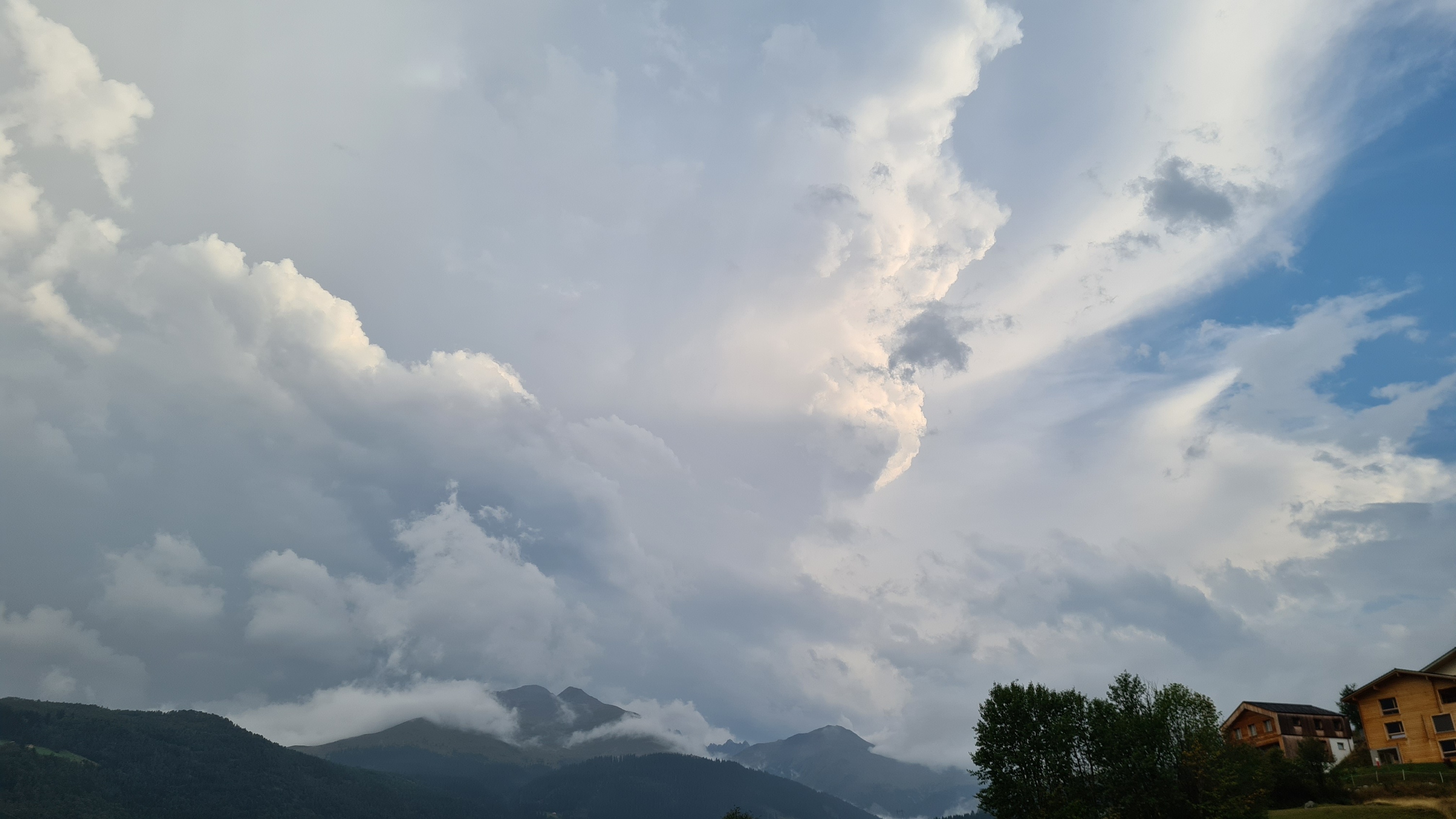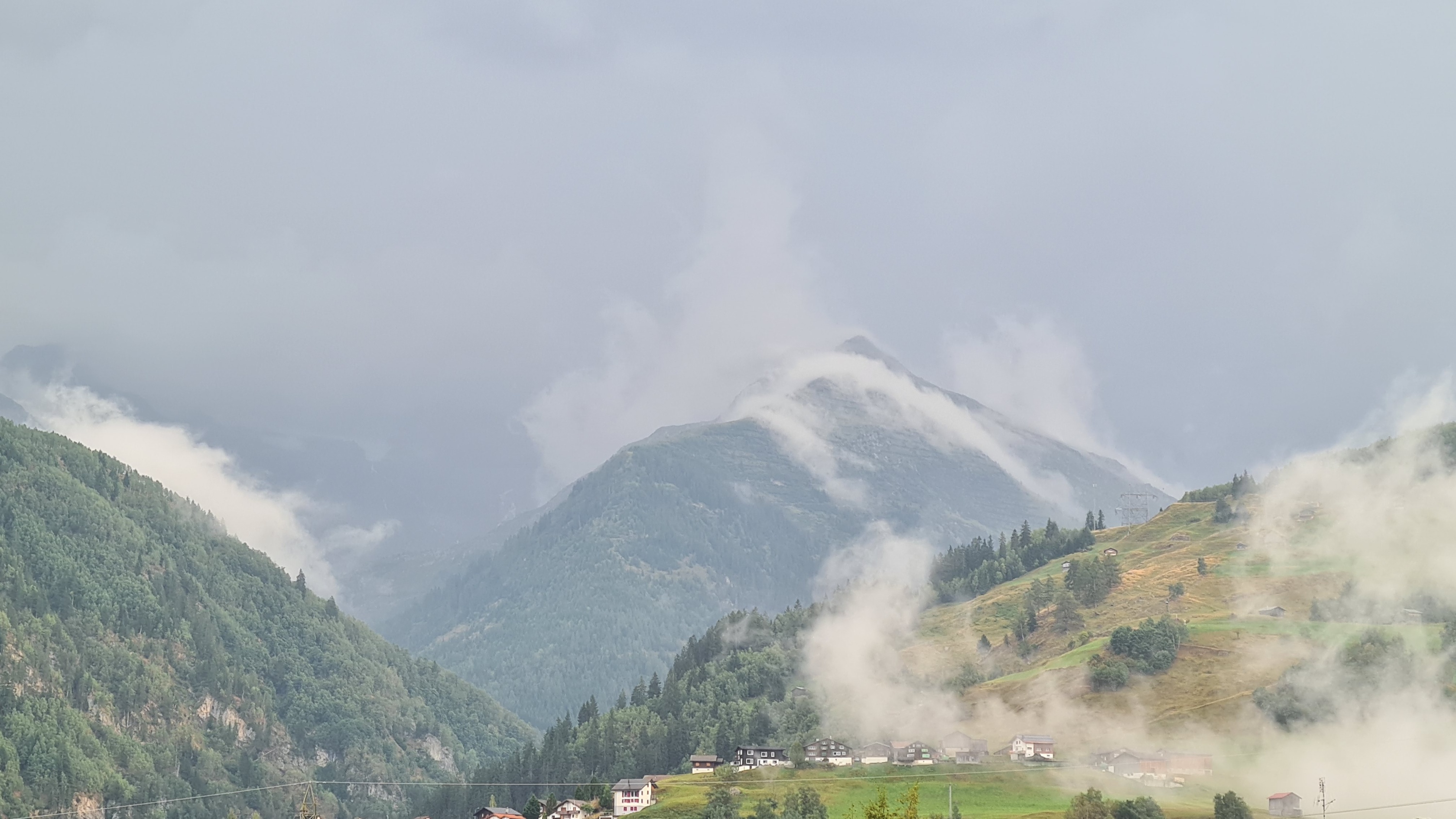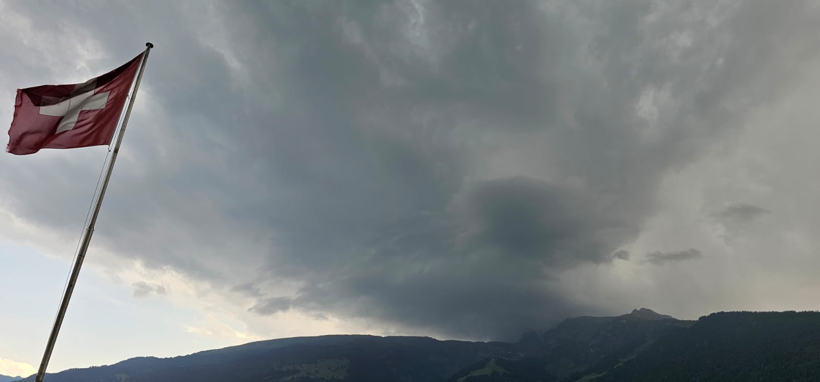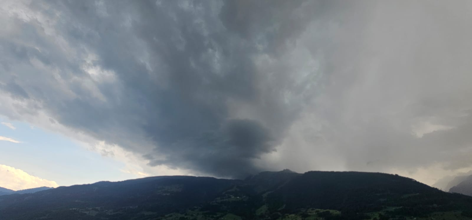 Böiger Bergwind (=Inflow) gerade in Disentis + 1. Donner