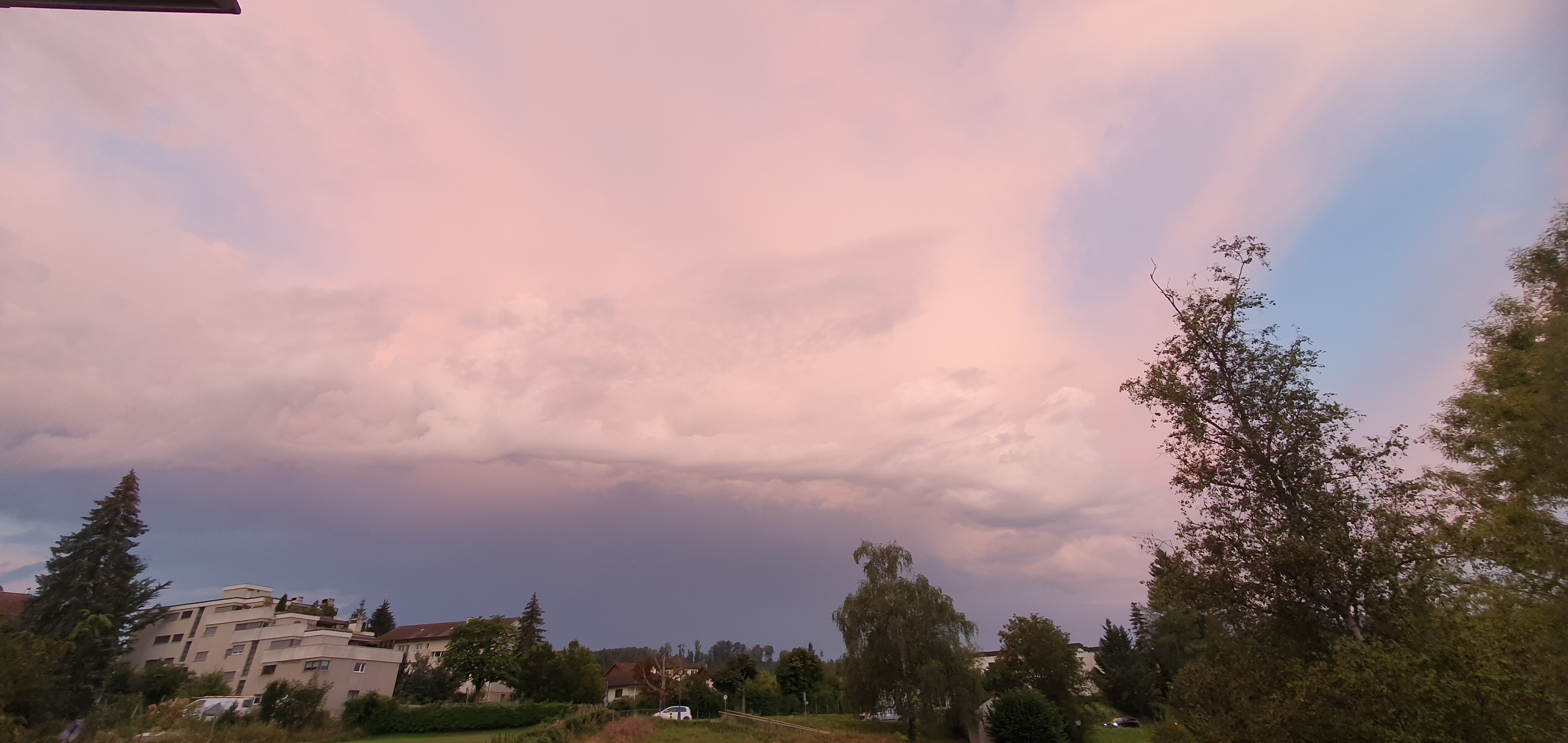 Zuhause um 5:30 erstes Gewitter und nun in Basel auch. Dazu noch Regenbogen und roter Himmel.