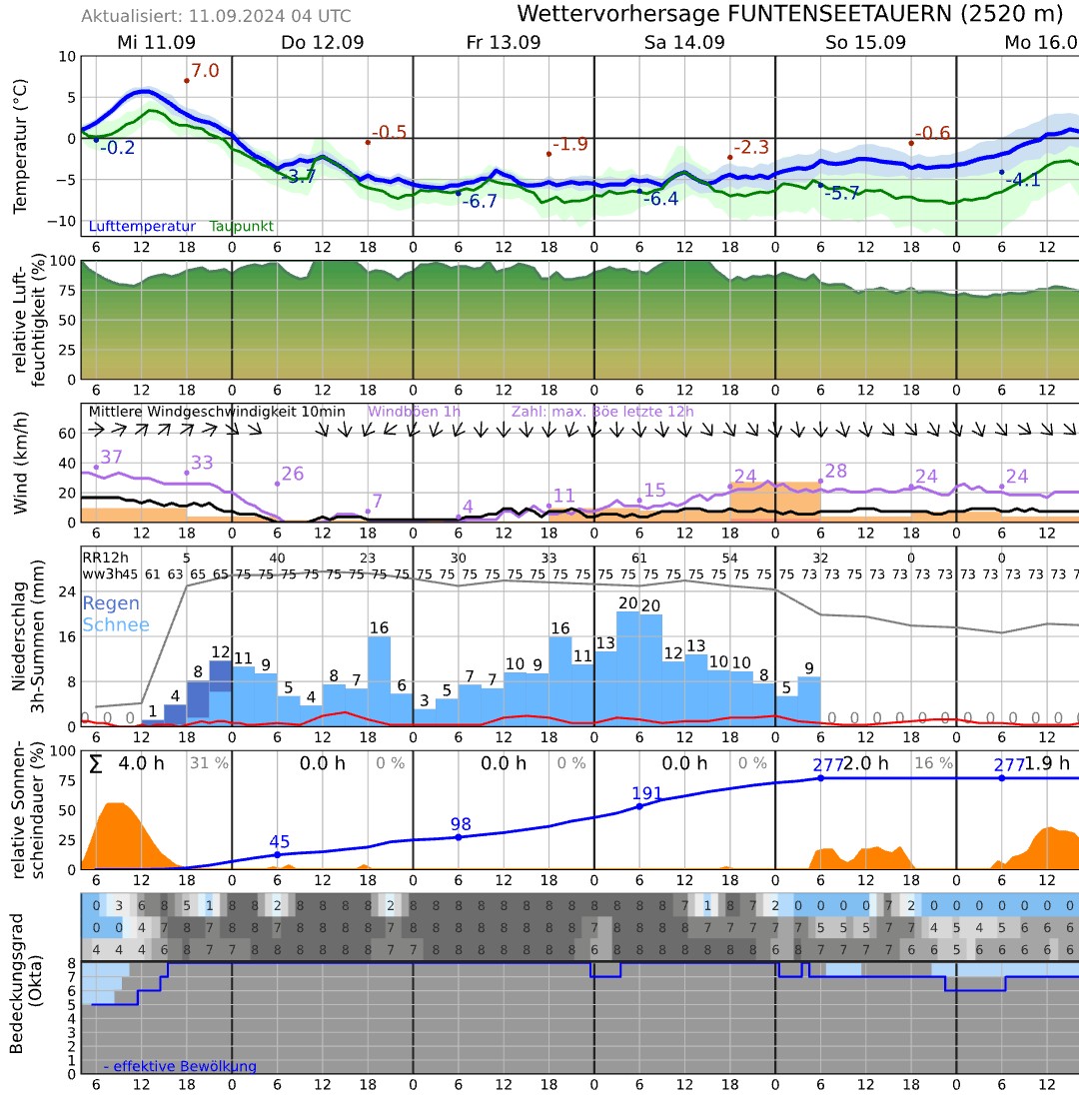 Am Mittwochabend erreicht uns die Kaltfront, die Schneefallgrenze sinkt unter 2000 Meter. Von Donnerstag bis sicher Samstag liegt der Alpenraum (v.a. die Schweiz) dann im Einflussbereich von für die Jahreszeit sehr kalten Luftmassen. Die Schneefallgrenze dürfte inneralpin zweitweise auf 1200 Meter absinken, allenfalls sogar noch etwas tiefer, sofern die Niederschlagsabkühlung reinwirkt. Bis Samstag sind am Alpennordhang bis gegen 70 mm Niederschlag zu erwarten (wobei der Nordosten wohl stärker im Fokus liegt als die westlichen Gebiete). Oberhalb von 2000 Meter kommt eine ordentliche Ladung Neuschnee zusammen, gebietsweise wird sich aber auch in den mittleren Lagen eine Schneedecke ausbilden.