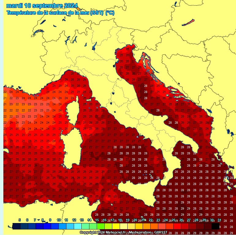Interessant ist auch, was südlich von uns passiert. Am Freitag findet nämlich ein Abtropfprozess statt, das heisst die Kaltluft tropft ins Mittelmeer. Es bildet sich ein durchaus beeindruckendes Höhentief, das nach wie vor mit kalter Höhenluft angereichert ist. Gleichzeitig hat das westliche Mittelmeer immer noch eine Temperatur von 28/29 Grad. Man muss wohl niemandem erklären, dass diese Kombination - Höhentief polaren Ursprungs und feuchtwarme Mittelmeerpampe - ziemlich explosiv ist.