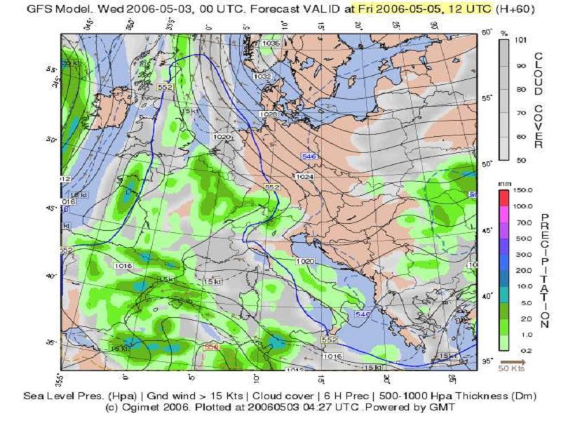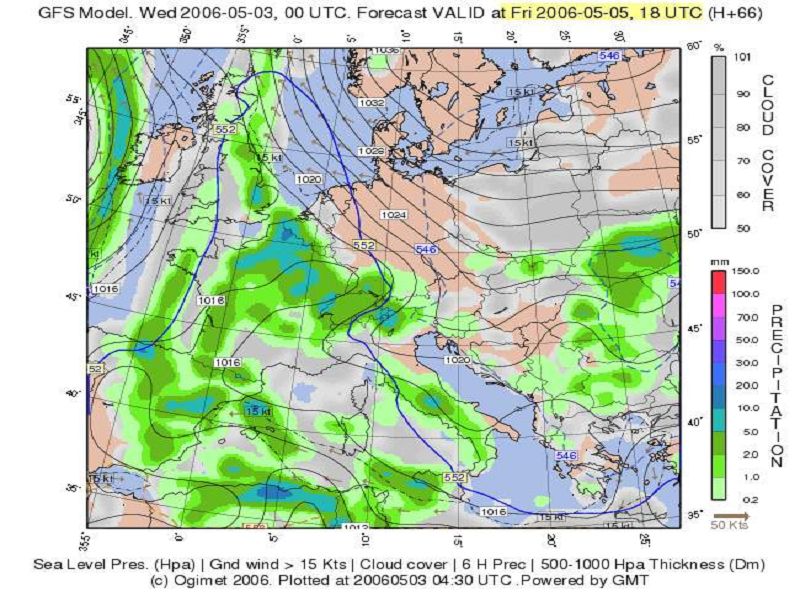 GFS rechnet für den Nachmittag mit ansehnlichen LI-Werten über Nordostfrankreich, welche bei uns entlang des Juras und an der Grenze zu Deutschland immerhin noch für einen LI-Wert von -3 reichen sollte. CAPE soll in diesen Gebieten bei 700 bis 800 liegen (wobei hier Vorsicht geboten ist, GFS berechnet das CAPE nicht optimal!). Am Boden WLA aus Südwesten und gleichzeitig im 500hpa Niveau KLA aus Osten. Zudem entwickelt sich im Laufe des Freitags über Ostfrankreich ein Gewittertief und grossflächige Hebung (700hpa Vertikalbewegung) wird auch immer mal wieder über der Schweiz gerechnet. Die Temperaturen/Taupunkte könnten am Nachmittag in der Nordwestschweiz bei ca. bei 20°/16° liegen.